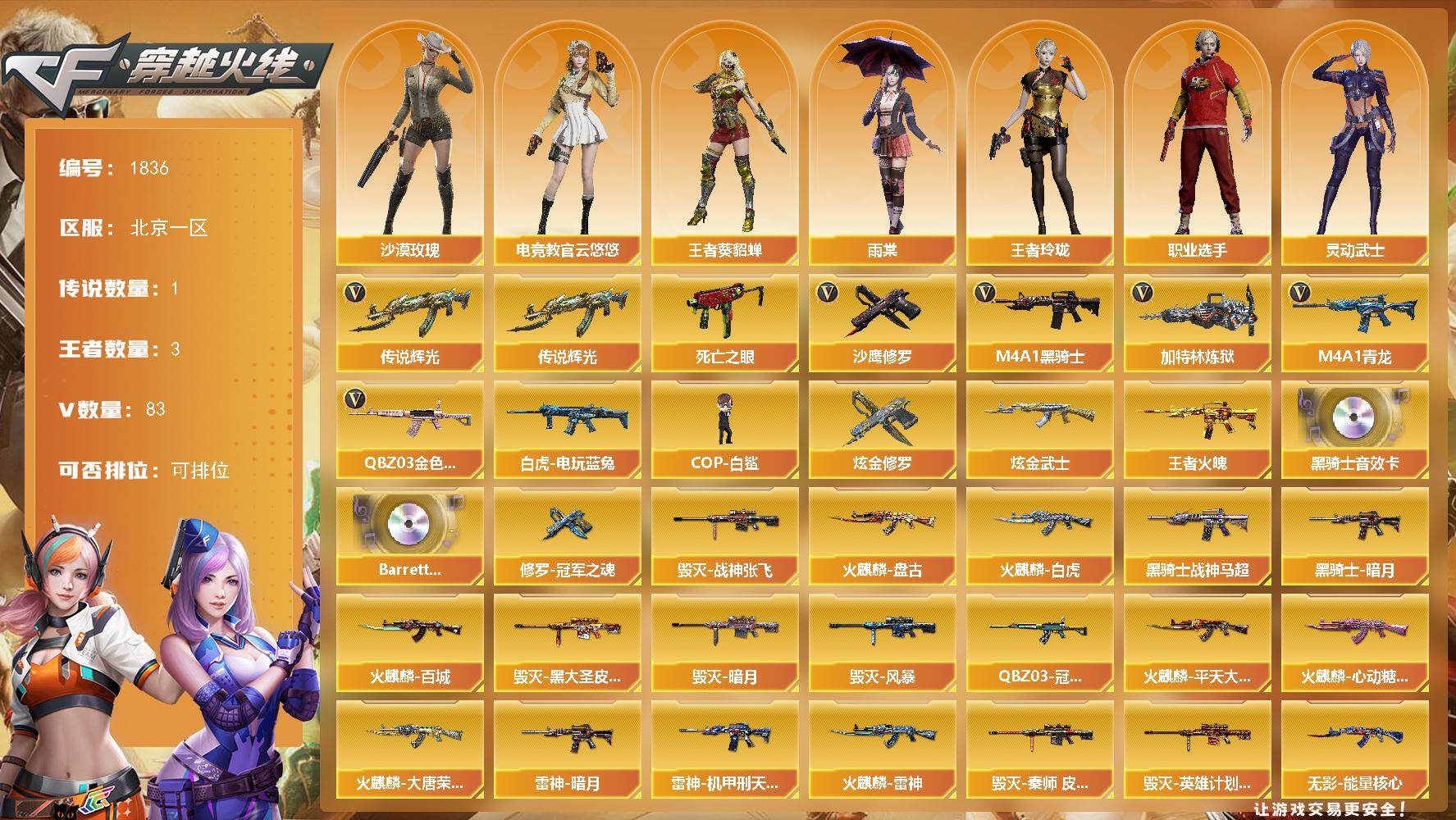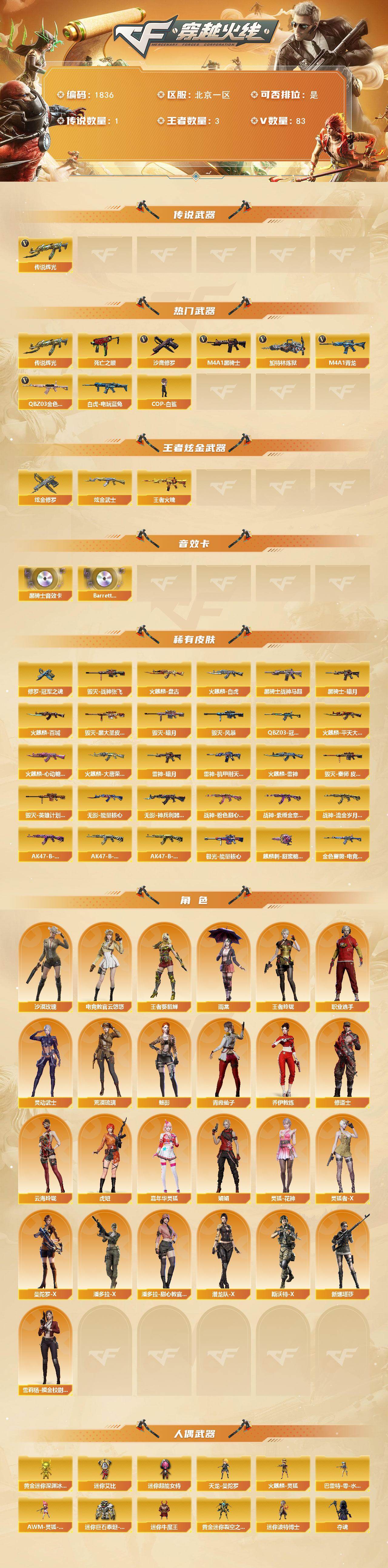[16127471]北京一区-83V-3王者-2炫金 【传说武器】:传说辉光 【热门武器】:传说辉光,QBZ03-金色蔷薇,M4A1-青龙,死亡之眼,白虎-电玩蓝兔,M4A1-黑骑士,加特林-炼狱,COP-白鲨,沙鹰-修罗 【王者炫金武器】:王者火魄,炫金武士,炫金修罗 【音效卡】:M4A1-黑骑士音效卡,Barrett-碧霄极光音效卡 【皮肤】:QBZ03-冠军之薇,金色蔷薇-电竞之星 皮肤,雷神-暗月,雷神-机甲刑天皮肤,火麒麟-雷神*2,火麒麟-平天大圣,火麒麟-盘古,火麒麟-白虎,火麒麟-百城,火麒麟-大唐荣光,火麒麟-心动糖果,毁灭-暗月,毁灭-战神张飞,毁灭-黑大圣皮肤,毁灭-风暴,毁灭-秦师 皮肤,毁灭-英雄计划 皮肤,黑骑士-暗月,黑骑士-战神马超,无影-能量核心,无影-神兵利器 皮肤,战神-粉色甜心皮肤*3,战神-紫绶金章皮肤*3,战神-流金岁月皮肤*4,AK47-B-常胜将军-曹操*2,AK47-B-常胜将军-刘备,AK47-B-常胜将军-孙权*3,极光-能量核心,修罗-冠军之魂,麒麟刺-甜蜜糖果 皮肤 【角色】:魅影,沙漠玫瑰,雨棠,电竞教官-云悠悠,荒漠琉璃,王者-葵-貂蝉,王者玲珑,乔伊教练,修道士,云海玲珑,虎妞,嘉年华灵狐,娟娟,灵动武士,灵狐-花神,灵狐者-X,曼陀罗-X,潘多拉-X,潘多拉-甜心教官,潜龙队-X,青霞仙子,斯沃特-X,新娜塔莎,雪莉杨-摸金校尉,职业选手 【人偶武器】:COP-白鲨,天龙-曼陀罗,火麒麟-灵狐,巴雷特-零-水下丽影,AWM-灵狐-15周年嘉年华,黄金迷你深渊冰龙,迷你牛魔王,黄金迷你裂空之翼,迷你波特博士,夺魂,迷你牛牛*2,生化手雷-机甲核心,深渊终结者手雷*3,迷你艾比,迷你超能女侍,迷你巨石泰坦-魔花研究所 【暴走生化】:死亡之眼,超级对讲机 【挑战大师】:冰龙粉碎者-白马银枪*2,激光毁灭者III-白马银枪,神圣爆裂者-末日III 【英雄级武器】:AK47-火麒麟*2,M4A1-雷神*2,M4A1-黑骑士,AK47-无影,AK12-天启,AN94-超新星*2,M4A1-武圣,M4A1-青龙,无影-神兵利器,FAMAS G2-天戎,M4A1-玫瑰精灵,QBZ03-金色蔷薇,烈火-动感闪耀,AK-47-猩红传说*7,AK47-B-战神*2,AK47-B-常胜将军,王者龙血-觉醒版,白虎-电玩蓝兔,王者芳薇-觉醒版,