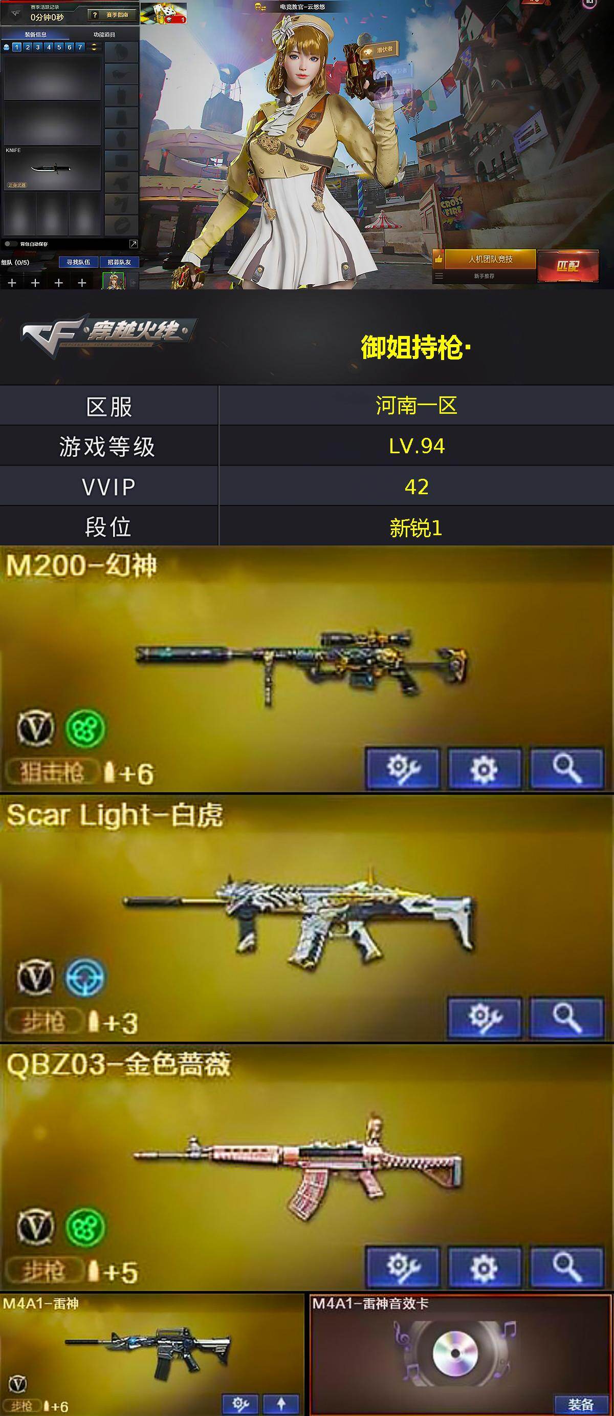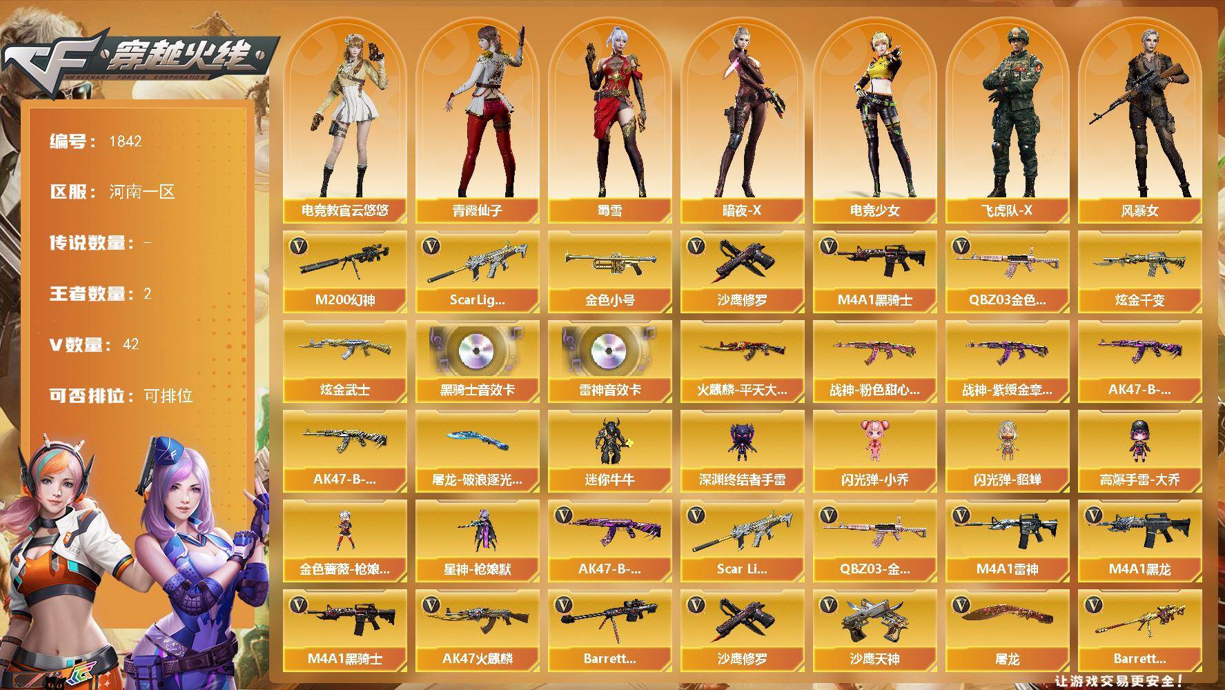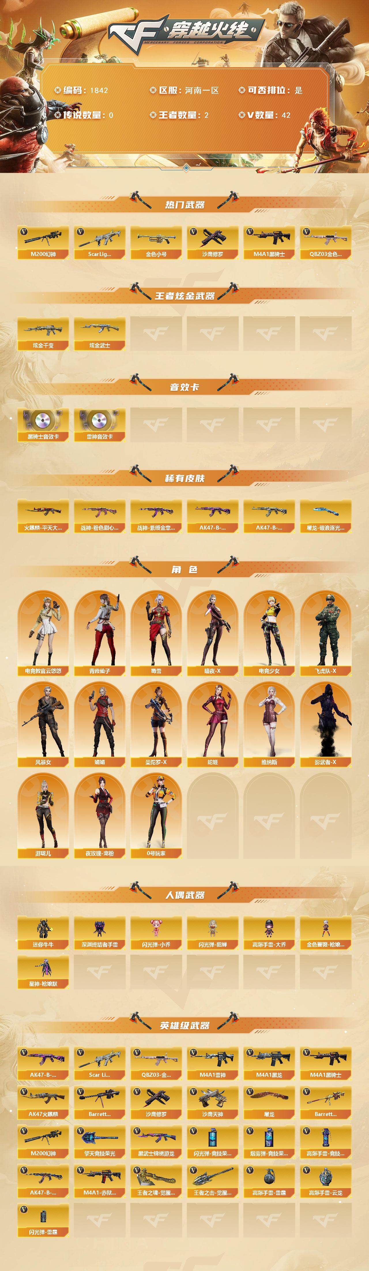 [16128295]河南一区-42V-2王者-2炫金 【热门武器】:QBZ03-金色蔷薇,Scar Light-白虎,M200-幻神,金色小号,M4A1-黑骑士,沙鹰-修罗 【王者炫金武器】:炫金千变,炫金武士 【音效卡】:M4A1-雷神音效卡,M4A1-黑骑士音效卡 【皮肤】:火麒麟-平天大圣,战神-粉色甜心皮肤,战神-紫绶金章皮肤,AK47-B-常胜将军-曹操*2,AK47-B-常胜将军-刘备*2,屠龙-破浪逐光 皮肤 【角色】:电竞教官-云悠悠,暗夜-X,电竞少女,飞虎队-X,风暴女,娟娟,0号玩家,曼陀罗-X,青霞仙子,蛇姬,蜀雪,维纳斯,夜玫瑰-宠粉,影武者-X,游珑儿 【人偶武器】:金色蔷薇-枪娘阿敏,星神-枪娘默,迷你牛牛,深渊终结者手雷,闪光弹-小乔,闪光弹-貂蝉,高爆手雷-大乔 【英雄级武器】:AK47-火麒麟,M4A1-黑龙,M4A1-雷神,M4A1-黑骑士,Scar Light-白虎,黑武士-锦绣游龙,QBZ03-金色蔷薇,AK47-B-战神,AK47-B-常胜将军,Barrett-毁灭,M200-幻神,Barrett-朱雀,沙鹰-修罗,沙鹰-天神,屠龙,擎天-竞技荣光,王者之啸-觉醒版,王者之击-觉醒版,高爆手雷-雷霆,高爆手雷-竞技荣光*6,高爆手雷-云龙,闪光弹-雷霆,闪光弹-竞技荣光*6,烟雾弹-竞技荣光*6,M4A1-赤狱骑士 【道具】:CFS限定背包,超级背包,绿色巨人,灵魂忍者,变异宝贝,迷雾幽灵,生化弹匣,夺命之镰,防化服,枪王排位28赛季金色流光,枪王排位29赛季金色流光,防弹头盔*2,防弹衣*2,C4工具钳*2,手雷包*2 【特殊枪械】:1白虎,1黑骑士