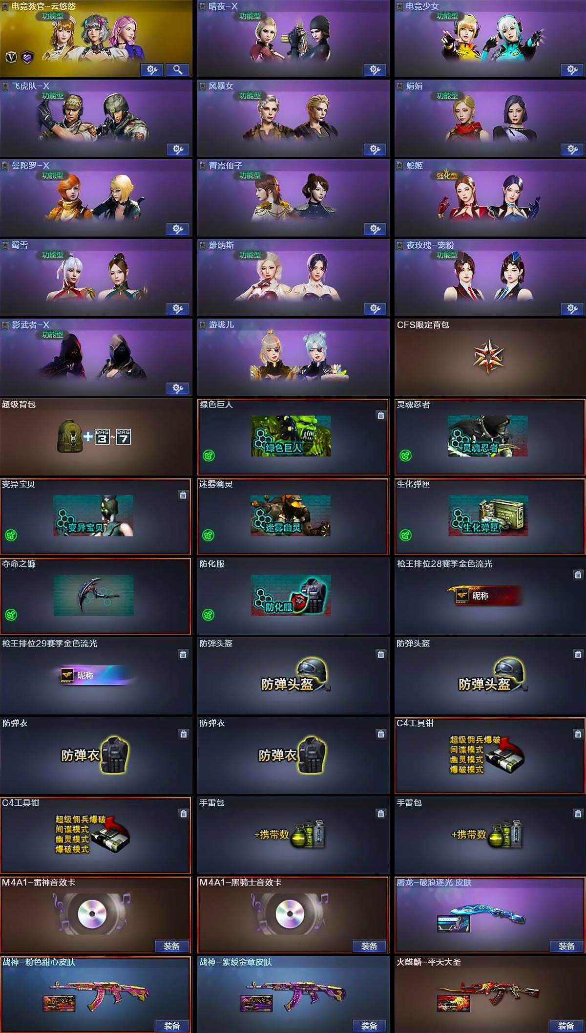 【道具】:CFS限定背包,超级背包,绿色巨人,灵魂忍者,变异宝贝,迷雾幽灵,生化弹匣,夺命之镰,防化服,枪王排位28赛季金色流光,枪王排位29赛季金色流光,防弹头盔*2,防弹衣*2,C4工具钳*2,手雷包*2