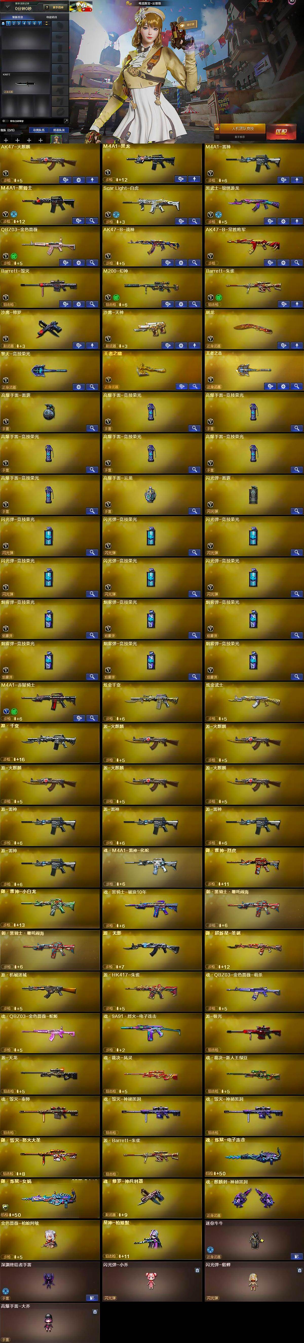 【英雄级武器】:AK47-火麒麟,M4A1-黑龙,M4A1-雷神,M4A1-黑骑士,Scar Light-白虎,黑武士-锦绣游龙,QBZ03-金色蔷薇,AK47-B-战神,AK47-B-常胜将军,Barrett-毁灭,M200-幻神,Barrett-朱雀,沙鹰-修罗,沙鹰-天神,屠龙,擎天-竞技荣光,王者之啸-觉醒版,王者之击-觉醒版,高爆手雷-雷霆,高爆手雷-竞技荣光*6,高爆手雷-云龙,闪光弹-雷霆,闪光弹-竞技荣光*6,烟雾弹-竞技荣光*6,M4A1-赤狱骑士