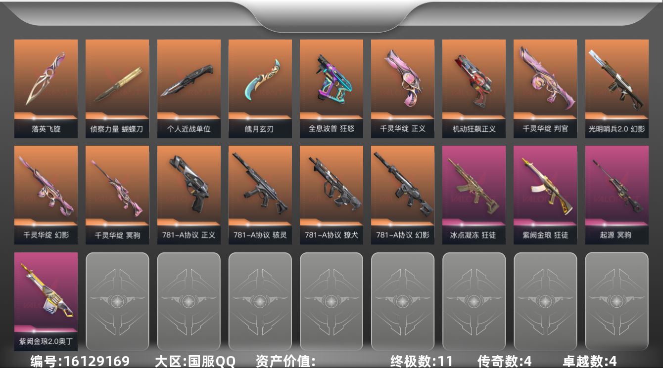 [16129169]【套装】:781-A协议套装,千灵华绽套装 【英雄】:炼狱,维斯,暮蝶,壹决,铁臂,捷风,幽影,不死鸟,贤者,猎枭,蝰蛇,零,芮娜,奇乐,尚勃勒,霓虹,星礈,K/O,盖可,黑梦 【近战武器】:近战武器-侦察力量 蝴蝶刀,近战武器-落英飞旋,近战武器-个人近战单位,近战武器-魄月玄刃 【狂徒】:狂徒-冰点凝冻,狂徒-紫阙金琅 【幻影】:幻影-781-A协议,幻影-光明哨兵//2.0,幻影-千灵华绽,幻影-战术小伙伴 【戍卫】:戍卫-钢轨卫士,戍卫-珍珠棘贝,戍卫-战术熊与伙伴们 【獠犬】:獠犬-781-A协议,獠犬-战术小伙伴 【冥驹】:冥驹-千灵华绽,冥驹-起源,冥驹-复古浪潮 【飞将】:飞将-光导纤维,飞将-战术熊与伙伴们 【莽侠】:莽侠-纤云弄巧 【战神】:战神-深海水族 【奥丁】:奥丁-紫阙金琅//2.0,奥丁-战术小伙伴 【判官】:判官-千灵华绽 【雄鹿】:雄鹿-复古浪潮 【骇灵】:骇灵-781-A协议,骇灵-流星兵团,骇灵-珍珠棘贝,骇灵-光导纤维 【蜂刺】:蜂刺-深海水族,蜂刺-纤云弄巧,蜂刺-战术小伙伴 【标配】:标配-光导纤维,标配-战术熊与伙伴们 【正义】:正义-781-A协议,正义-机动狂飙,正义-千灵华绽 【狂怒】:狂怒-全息波普,狂怒-钢轨卫士,狂怒-珍珠棘贝,狂怒-战术熊与伙伴们 【短炮】:短炮-钢轨卫士,短炮-深海水族,短炮-纤云弄巧 【卡面】:精灵大战 卡面,欢迎来到底城 卡面,南瓜盛典 卡面,修车达人 卡面,正义的化身 卡面,梦幻奶茶 卡面,暮蝶工牌 卡面,战术熊与伙伴们 卡面,源能反应 卡面,流星兵团 卡面,纤云弄巧 卡面,暂别喧嚣 卡面,打造专属狂徒 卡面,零点嗅探设计图 卡面,夜班 卡面,瓦娃脸雪糕 卡面 ,沙雕爆能器 卡面,无畏契约GO!第一卷:芮娜 卡面,深海水族 卡面,珍珠棘贝 卡面,复古浪潮 卡面,盖可工牌 卡面,清除名单 卡面,无畏契约GO!第一卷:零 卡面,龍记 卡面,《双城之战》金克丝 卡面,蝰蛇vs幽影 卡面,势不可挡//盖可 卡面,逆向独行 卡面 ,同步耍酷 卡面,完美调谐 卡面 ,没有什么能逃过我的眼睛 卡面,光导纤维 卡面,战术小伙伴 卡面,钢轨卫士 卡面,暗枪 卡面,别冒尖 卡面,代号红色 卡面,新兵报到 卡面,V契约 卡面,无畏契约 卡面,781-A协议 卡面 【喷漆】:都算到了 喷漆,控场勿近 喷漆