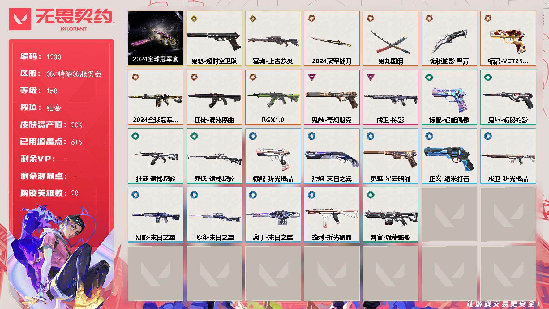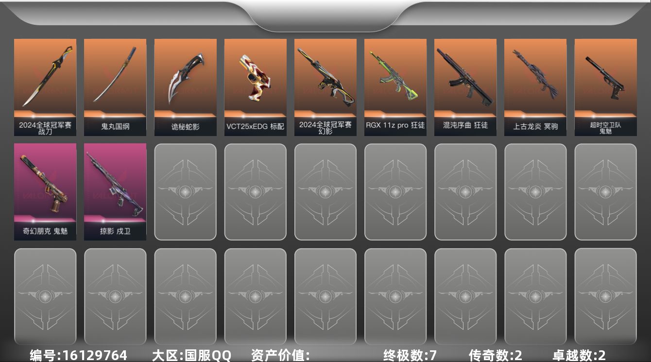 [16129764]【套装】:2024全球冠军赛套装 【英雄】:幻棱,炼狱,维斯,暮蝶,钛狐,壹决,铁臂,捷风,雷兹,幽影,不死鸟,贤者,猎枭,蝰蛇,零,芮娜,奇乐,尚勃勒,霓虹,斯凯,夜露,星礈,K/O,海神,盖可,黑梦,钢锁 【近战武器】:近战武器-2024全球冠军赛 战刀,近战武器-鬼丸国纲,近战武器-诡秘蛇影 军刀 【狂徒】:狂徒-混沌序曲,狂徒-RGX 11z Pro,狂徒-诡秘蛇影 【幻影】:幻影-2024全球冠军赛,幻影-末日之翼 【戍卫】:戍卫-掠影,戍卫-折光棱晶 【冥驹】:冥驹-上古龙炎 【飞将】:飞将-末日之翼 【莽侠】:莽侠-诡秘蛇影 【奥丁】:奥丁-末日之翼 【判官】:判官-诡秘蛇影 【蜂刺】:蜂刺-折光棱晶 【标配】:标配-超能偶像,标配-折光棱晶 【VCT手枪】:标配-VCT25 x EDG 【正义】:正义-纳米打击 【鬼魅】:鬼魅-超时空卫队,鬼魅-奇幻朋克,鬼魅-诡秘蛇影,鬼魅-星云暗涌 【短炮】:短炮-末日之翼 【卡面】:终章:激斗汉堡 卡面,进入射程 卡面,《双城之战》拥抱 卡面,精灵大战 卡面,欢迎来到底城 卡面,南瓜盛典 卡面,VCT CN首冠 卡面,悠享食光 卡面,修车达人 卡面,热舞环节 卡面,正义的化身 卡面,终章:生意人麦宝 卡面,铁之华 卡面,2024全球冠军赛 卡面,时间到 卡面,最高舞台 卡面,声感陷阱设计图 卡面,梦幻奶茶 卡面,零点嗅探设计图 卡面,无畏契约GO!第一卷:芮娜 卡面,清除名单 卡面,无畏契约GO!第一卷:零 卡面,逆向独行 卡面 ,暗枪 卡面,铁臂设计图 卡面,代号红色 卡面,冰淇淋店 卡面,新兵报到 卡面,友军火力 卡面,V契约 卡面,无畏契约 卡面 【喷漆】:嗨宝南瓜灯 喷漆,嘭! 喷漆,都算到了 喷漆,控场勿近 喷漆,小丑猫 喷漆,熊抱 喷漆,蛋糕还是爆能器? 喷漆,2024全球冠军赛 喷漆,超级粉丝 喷漆,捷风差距 喷漆,惊声尖叫 喷漆,拼一枪 喷漆,我的刀呢? 喷漆,新潮流 喷漆,买装还是存钱 喷漆,醒狮贺春 喷漆,老铁困了 喷漆,胜利属于无畏契约 喷漆,GLHF 喷漆,无畏契约 喷漆 【挂饰】:终章:猫猫木乃伊 挂饰,悠闲鸡块 挂饰,伞绳 挂饰,《双城之战》小蛋糕 挂饰,第九季//第三幕 纪念币 挂饰,无畏契约GO!第一卷 芮娜 挂饰,无畏契约GO!第一卷 零 挂饰,熔岩灯 挂饰,瞬云履 挂饰,第