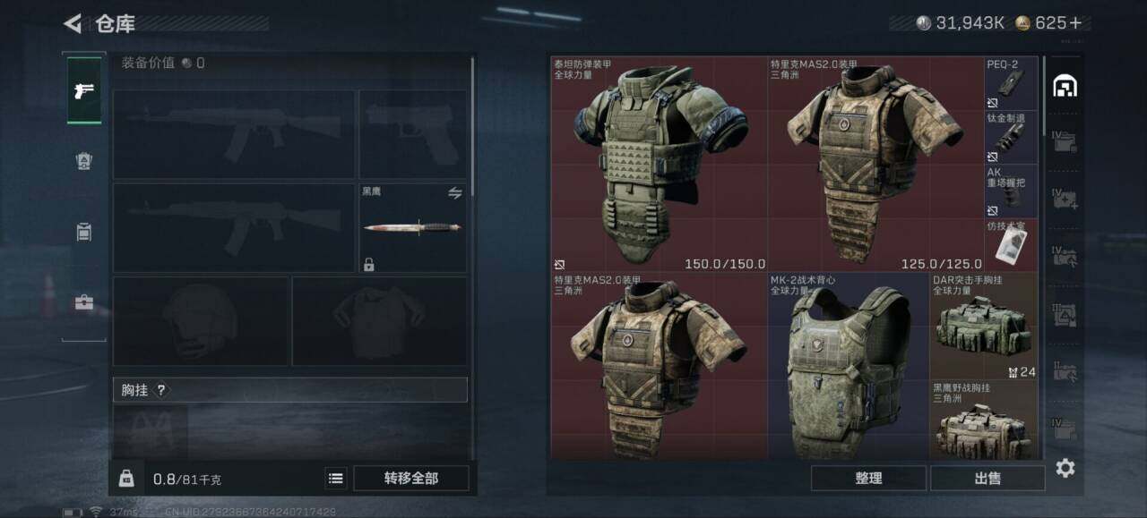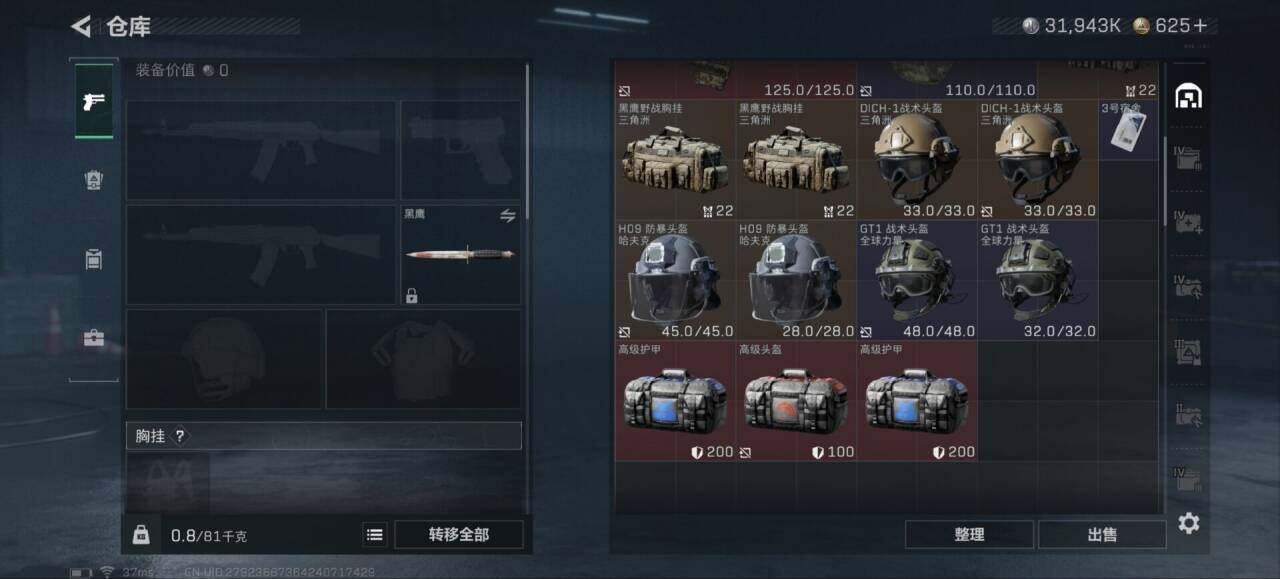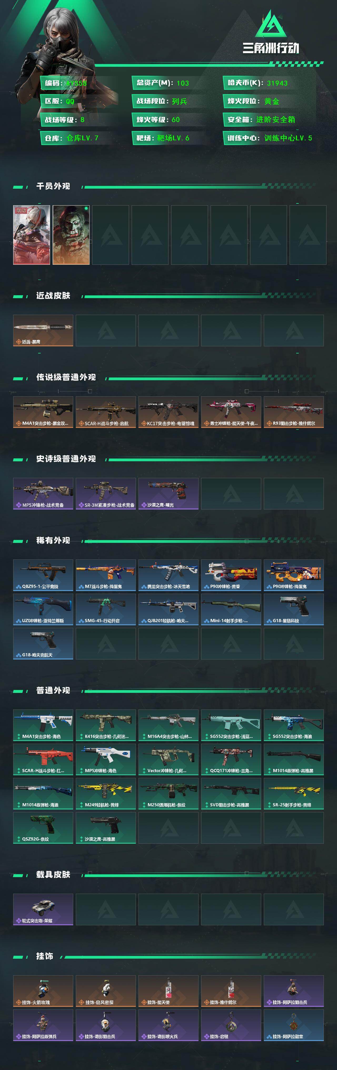 [16134393]【特价出售/店主推荐】103m总资产-31943k哈伏币-60烽火等级-黄金-8战场等级-列兵 【干员外观】:骇爪-维什戴尔,红狼-电锯惊魂 【近战皮肤】:近战-黑鹰 【传说外观】:M4A1突击步枪-蚀金玫瑰,SCAR-H战斗步枪-启航,KC17突击步枪-电锯惊魂,勇士冲锋枪-能天使-午夜邮差,R93狙击步枪-维什戴尔 【史诗外观】:MP5冲锋枪-战术竞备,SR-3M紧凑突击步枪-战术竞备,沙漠之鹰-曙光 【稀有外观】:QBZ95-1突击步枪-公平竞技,M7战斗步枪-捣蛋鬼,腾龙突击步枪-冰天雪地,P90冲锋枪-黄昏,P90冲锋枪-捣蛋鬼,UZI冲锋枪-亚特兰蒂斯,SMG-45-行动开启,QJB201轻机枪-哈夫克卫队,Mini-14射手步枪-荣耀列队,G18-星链科技,G18-哈夫克航天 【普通外观】:M4A1突击步枪-海色,K416突击步枪-几何迷彩,M16A4突击步枪-山林猎人,SG552突击步枪-浅蓝涂装,SG552突击步枪-海浪,SCAR-H战斗步枪-红色涂装,MP5冲锋枪-海色,Vector冲锋枪-几何迷彩,QCQ171冲锋枪-三角洲力量,M1014霰弹枪-高雅黑,M1014霰弹枪-海浪,M249轻机枪-黄蜂,M250通用机枪-条纹,SVD狙击步枪-高雅黑,SR-25射手步枪-黄蜂,QSZ92G-条纹,沙漠之鹰-高雅黑 【载具外观】:轮式突击炮-荣耀 【挂饰】:挂饰-火箭玫瑰,挂饰-窃风密探,挂饰-能天使,挂饰-维什戴尔,挂饰-阿萨拉狙击兵,挂饰-阿萨拉霰弹兵*2,挂饰-诡影狙击兵*5,挂饰-诡影喷火兵*3,挂饰-启程,挂饰-阿萨拉徽章