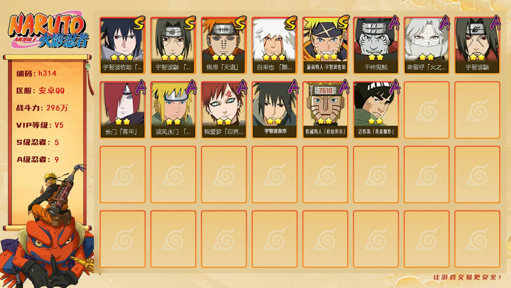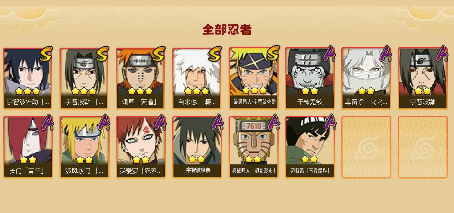 【S级忍者】:宇智波鼬「须佐能乎」(3星),自来也「舞之豪杰」(3星),佩恩「天道」(3星),宇智波佐助「永恒万花筒」(3星),漩涡鸣人·宇智波佐助(3星)
