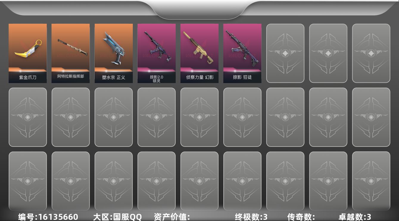 - [16910568]【英雄】:幻棱,炼狱,维斯,暮蝶,钛狐,壹决,铁臂,捷风,雷兹,幽影,不死鸟,贤者,猎枭,蝰蛇,零,芮娜,奇乐,尚勃勒,霓虹,斯凯,夜露,星礈,K/O,海神,盖可,黑梦,钢锁 【近战武器】:近战武器-RGX 11z Pro//3.0 爪刀,近战武器-落英飞旋,近战武器-荒土机兵 热能刀,近战武器-诡秘蛇影 军刀,近战武器-神圣领域 战刀,近战武器-日耀风暴 遗器 【狂徒】:狂徒-混沌序曲,狂徒-创·纪元,狂徒-RGX 11z Pro,狂徒-光荣异象,狂徒-冰点凝冻,狂徒-盖亚的复仇,狂徒-日冕雄师,狂徒-荒土机兵,狂徒-诡秘蛇影 【幻影】:幻影-侦察力量,幻影-异鳞魔蛇,幻影-神圣领域,幻影-纳米打击,幻影-末日之翼 【戍卫】:戍卫-天界神兵,戍卫-逆冲蛮牛,戍卫-月球哨兵,戍卫-折光棱晶 【獠犬】:獠犬-归零者,獠犬-神圣领域,獠犬-逆冲蛮牛 【冥驹】:冥驹-堕天遗武,冥驹-盖世英雄,冥驹-荒土机兵,冥驹-星云暗涌 【飞将】:飞将-末日之翼 【莽侠】:莽侠-诡秘蛇影,莽侠-月球哨兵 【战神】:战神-神圣领域 【奥丁】:奥丁-纳米打击,奥丁-末日之翼 【判官】:判官-千灵华绽,判官-诡秘蛇影,判官-纳米打击x 【雄鹿】:雄鹿-逆冲蛮牛,雄鹿-月球哨兵 【骇灵】:骇灵-荒土机兵,骇灵-无限竞技,骇灵-星云暗涌 【蜂刺】:蜂刺-星云暗涌,蜂刺-折光棱晶 【标配】:标配-荒土机兵,标配-折光棱晶 【正义】:正义-千灵华绽,正义-西部未来,正义-纳米打击,正义-月球哨兵 【鬼魅】:鬼魅-耀鳞威龙,鬼魅-诡秘蛇影,鬼魅-星云暗涌 【狂怒】:狂怒-神圣领域,狂怒-逆冲蛮牛 【短炮】:短炮-末日之翼 【卡面】:终章:激斗汉堡 卡面,进入射程 卡面,分崩离析 卡面,纳米打击 卡面,抑制技术 卡面,激斗汉堡 卡面,瓦娃脸雪糕 P2 卡面,从黄昏到黎明 卡面,荒土机兵 卡面,银弹猎手 卡面,逆冲蛮牛 卡面,精灵大战 卡面,南瓜盛典 卡面,树懒大作战 卡面,无垠星环 卡面,《双城之战》金克丝 卡面,胡桃狂想 卡面,代号红色 卡面,新兵报到 卡面,V契约 卡面,无畏契约 卡面 【喷漆】:小小心意 喷漆,战“素”兔 喷漆,宇宙的指引 喷漆,请求重启 喷漆,逆冲蛮牛 喷漆,纳米打击 喷漆,鼻尖上的蝴蝶 喷漆,简笔画黯兽 喷漆,独守蝰腹 喷漆,他们将落荒而逃 喷漆,通缉:战术企鹅 喷漆,荒土机