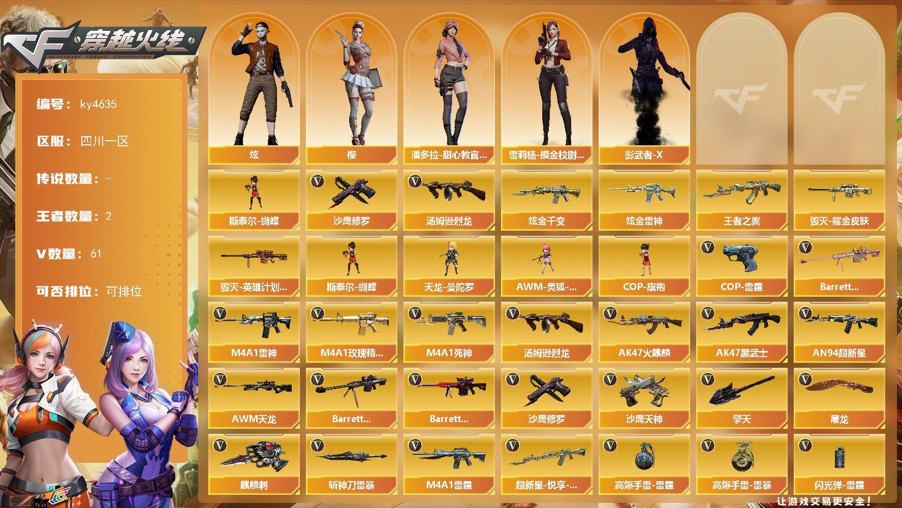 [16136752]四川一区-61V-2王者-2炫金 【热门武器】:汤姆逊-烈龙,斯泰尔-蝴蝶,沙鹰-修罗 【王者炫金武器】:王者之翼,炫金千变,炫金雷神 【皮肤】:毁灭耀金皮肤,毁灭-英雄计划 皮肤 【角色】:樱,炫,潘多拉-甜心教官,雪莉杨-摸金校尉,影武者-X 【人偶武器】:天龙-曼陀罗,斯泰尔-蝴蝶,AWM-灵狐-15周年嘉年华,COP-旗袍*2 【英雄级武器】:AK47-火麒麟,M4A1-雷神,M4A1-死神,AK47-黑武士*2,AN94-超新星,M4A1-雷霆,M4A1-玫瑰精灵,超新星-悦享-觉醒版,AWM-天龙,Barrett-毁灭*2,Barrett-极光,Barrett-金色蔷薇,汤姆逊-烈龙,沙鹰-修罗,沙鹰-天神,COP-雷霆*2,屠龙,擎天*2,麒麟刺,斩神刀-雷暴,高爆手雷-雷霆*7,高爆手雷-雷暴*3,闪光弹-雷霆*7,闪光弹-雷暴*3,烟雾弹-雷霆*7,烟雾弹-雷暴*3 【道具】:炫彩背包,灵魂忍者,迷雾幽灵,夺命之镰,防化服*2,防弹头盔*2,防弹衣*2,C4工具钳*2,手雷包*2 【特殊枪械】:蝴蝶斯泰尔+1烈龙,1烈龙,1蝴蝶斯泰尔