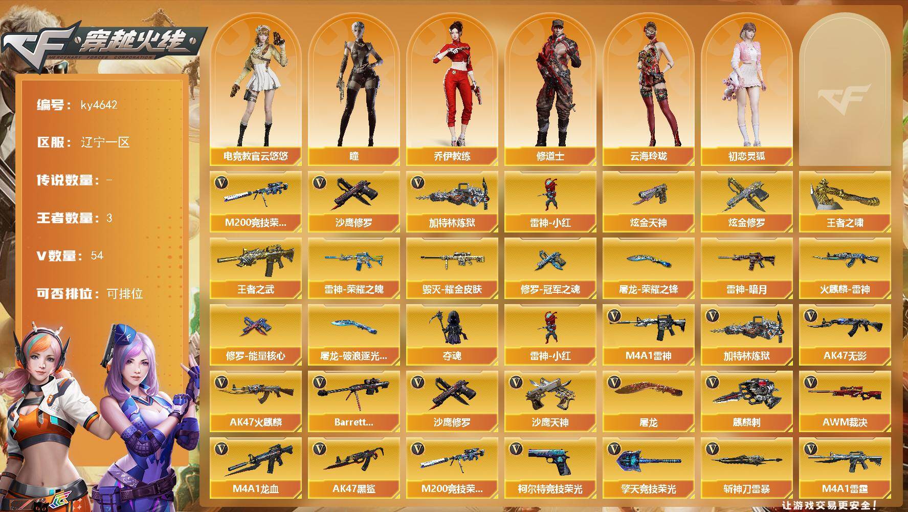 [16137350]辽宁一区-54V-3王者-2炫金 【热门武器】:M200-竞技荣光,加特林-炼狱,雷神-小红,沙鹰-修罗 【王者炫金武器】:王者之武,王者之啸,炫金天神,炫金修罗 【皮肤】:雷神-暗月,雷神-荣耀之魄,火麒麟-雷神,毁灭耀金皮肤,修罗-能量核心,修罗-冠军之魂,屠龙-荣耀之锋,屠龙-破浪逐光 皮肤 【角色】:瞳,电竞教官-云悠悠,乔伊教练,修道士,云海玲珑,初恋灵狐 【人偶武器】:雷神-小红,夺魂 【英雄级武器】:AK47-火麒麟,M4A1-雷神,AK47-无影*2,AK47-黑鲨*3,M4A1-龙血,M4A1-雷霆,AK-47-猩红传说,王者火魄-觉醒版,Barrett-毁灭,AWM-裁决,M200-竞技荣光,加特林-炼狱,沙鹰-修罗,沙鹰-天神,柯尔特-竞技荣光,屠龙,麒麟刺,擎天-竞技荣光*4,斩神刀-雷暴,高爆手雷-雷霆,高爆手雷-雷暴,高爆手雷-竞技荣光*5,闪光弹-雷霆,闪光弹-雷暴,闪光弹-竞技荣光*5,烟雾弹-雷霆,烟雾弹-雷暴,烟雾弹-竞技荣光*5 【道具】:CFS限定背包,炫彩背包,夺命之镰,防化服,枪王排位28赛季金色流光,枪王排位29赛季金色流光,C4-红龙,防弹头盔,防弹衣,C4工具钳,手雷包 【特殊枪械】:1炼狱