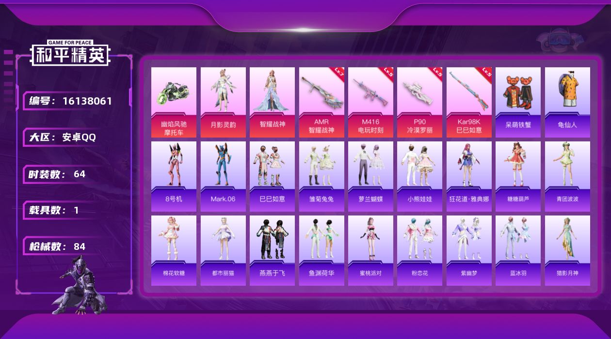 - [12904964]安卓 手Q-5粉装-7特效枪-3载具-7粉色飞行器-56966热力值-16王牌印记-132套装-175枪皮 【热门品类】:套装-深海小丑鱼,套装-龟仙人,套装-粉红小猪,角色-Mark.06 【粉色载具】:护世瑞兽,冰绡玉鳞,辉羽雀灵自行车 【粉色套装】:粉装-齐天大圣,粉装-镜光幻境,角色-萨利娅,粉装-星穹咏叹调,角色-冰魄 【粉色枪皮等级】:SCAR-L-金蛇镇世(三级),GROZA-镜光银凌(五级),AKS-74U-星穹咏叹调(六级),Kar98K-巳巳如意(五级),Mk14-甜梦熊击(五级),DP-28-豹影疾电(五级),MG3-辉羽雀灵(三级) 【粉色枪皮】:SCAR-L-金蛇镇世,GROZA-镜光银凌,AKS-74U-星穹咏叹调,Kar98K-巳巳如意,Mk14-甜梦熊击,DP-28-豹影疾电,MG3-辉羽雀灵 【粉色飞行器】:齐天大圣飞行器,千面幻镜飞行器,镜光幻境飞行翼,万象金身飞行器,百变魔方飞行器,雀灵庇佑飞行器 【粉色降落伞】:暗夜玫瑰降落伞,千面幻镜降落伞,萌物绒绒降落伞,繁龙极客降落伞,霓虹漫游降落伞,创世·救赎降落伞,临安公主降落伞,金蛇镇世降落伞,幻影飞狐降落伞,雪月幻音降落伞,星穹咏叹调降落伞,辉羽雀灵降落伞,幻彩电音降落伞 【稀有套装】:套装-龟仙人,玩偶服-憨乐熊二,套装-巳巳如意,套装-圣穹绘梦,套装-小鸟芋圆,套装-糖糖葫芦,套装-青团波波,套装-棉花软糖,角色-临安公主,角色-怀庆长公主,套装-燕燕于飞,套装-鱼渊荷华,套装-旋风灵鼠,套装-粉恋花,套装-紫幽梦,套装-蓝冰羽,套装-星影赞美诗,套装-星渊小夜曲,套装-极速光影,套装-彩虹兔,套装-云朵鹅,套装-雪绒豹,套装-蜜露汐语,角色-敖闰,角色-申公豹 【稀有枪皮】:AKM-彩虹符号,AKM-生命誓言,AKM-破晓战魂,AKM-虎虎生威,AKM-龙的传人,M16A4-幻世战舞者,M16A4-红色方程式,M16A4-蓝色火焰,SCAR-L-玉兔迎春,SCAR-L-红色方程式,M416-糯团青竹,M416-红色方程式,M416-蓝色火焰,GROZA-田园牧歌,AUG-海螺星光,AUG-耀粉歌者,AUG-金蛇镇世,M762-天降萌叽,M762-彩虹符号,M762-萌物绒绒,M762-云朵鹅,Mk47-妙红点点,Mk47-洛神天依,G36C-星穹咏叹调,AC-VAL-天降