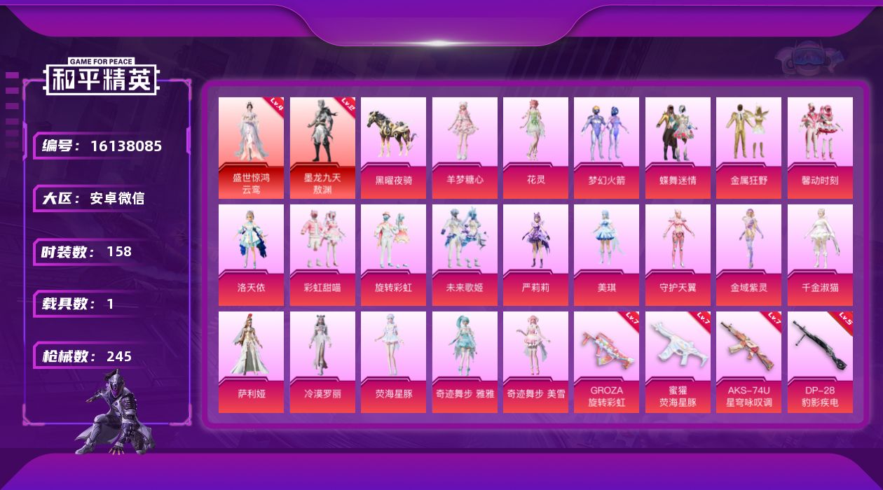 【粉色枪皮等级】:M416-灵猫魔法师(三级),GROZA-旋转彩虹(七级),蜜獾-荧海星豚(七级),ARX-无垠阁(四级),AKS-74U-星穹咏叹调(七级),Kar98K-巳巳如意(五级),Mk14-盛世惊鸿(三级),DP-28-豹影疾电(五级),MG3-洛神天依(四级),MG3-辉羽雀灵(三级)