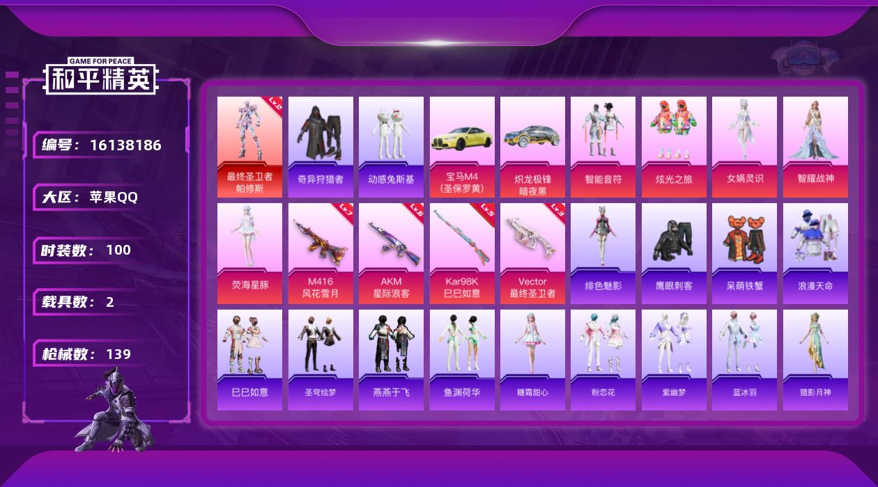 [16138186]【特价出售/店主推荐】 苹果 手Q-1神装-5粉装-4特效枪-2载具-2粉色飞行器-4.7w热力值-6王牌印记-100套装-139枪皮【红色神装等级】:最终圣卫者-帕修斯(二级)【红色角色神装】:最终圣卫者-帕修斯【热门品类】:套装-浪漫天命,套装-奇异狩猎者,套装-动感兔斯基人偶服【粉色套装】:粉装-智能音符,粉装-炫光之旅,角色-女娲灵识,角色-智耀战神,角色-荧海星豚【粉色枪皮等级】:AKM-星际浪客(六级),M416-风花雪月(七级),Vector-最终圣卫者(三级),Kar98K-巳巳如意(五级)【粉色载具】:宝马M4(圣保罗黄),炽龙极锋(暗夜黑)【粉色枪皮】:AKM-星际浪客,M416-风花雪月,Vector-最终圣卫者,Kar98K-巳巳如意【粉色飞行器】:繁龙极客飞行器,终晖之翼飞行器