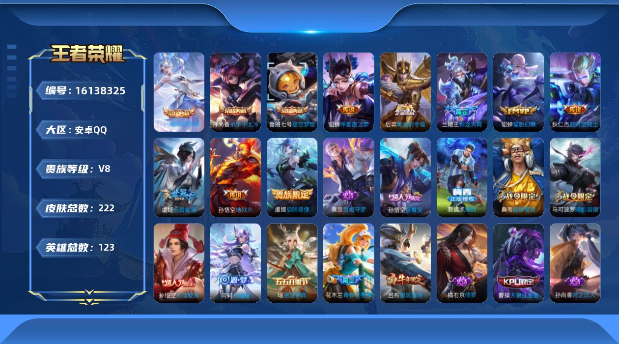 [16138325]安卓Q-V8-最强王者段位-123英雄-222皮肤-3典藏皮肤-8传说-48史诗
