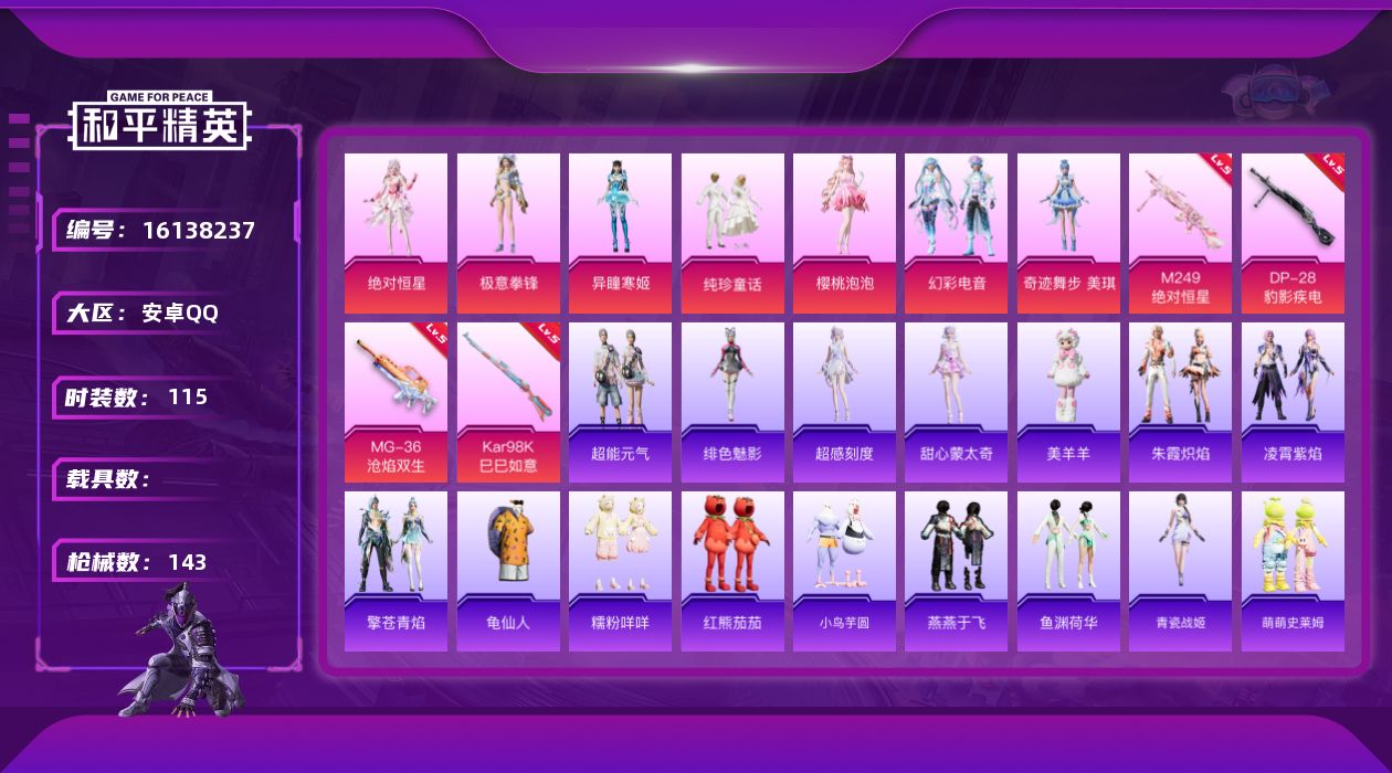 - [13014046]安卓 手Q-9粉装-12特效枪-0载具-4粉色飞行器-59267热力值-12王牌印记-133套装-186枪皮 【热门品类】:粉装-缤纷油彩,套装-浪漫天命,套装-胖达圆圆,套装-龟仙人,套装-暗影哥特,角色-六号稻草人 【粉色套装】:粉装-缤纷油彩,粉装-极致幻想,粉装-馨动时刻,角色-水仙星,粉装-莲影清波,粉装-傲傲奶龙,角色-月影灵韵,粉装-绯果甜心,粉装-星穹咏叹调 【粉色枪皮等级】:AKM-绿萝繁花(五级),SCAR-L-纯梦嫁纱(七级),M416-风花雪月(五级),M416-电玩时刻(五级),GROZA-镜光银凌(五级),AUG-暖羊咩咩(五级),AUG-圣斗士星矢(五级),M762-青锋波束(五级),UMP45-量子极限(五级),Kar98K-巳巳如意(五级),Mk14-甜梦熊击(五级),DP-28-千金淑猫(五级) 【粉色枪皮】:AKM-绿萝繁花,SCAR-L-纯梦嫁纱,M416-风花雪月,M416-电玩时刻,GROZA-镜光银凌,AUG-暖羊咩咩,AUG-圣斗士星矢,M762-青锋波束,UMP45-量子极限,Kar98K-巳巳如意,Mk14-甜梦熊击,DP-28-千金淑猫 【粉色飞行器】:歌者泠鸢飞行器,萌物绒绒飞行器,百变魔方飞行器 【粉色降落伞】:神秘黑猫降落伞,音爆索尼克降落伞,畅跳缤纷降落伞,第五大道降落伞,闲梦青缨降落伞,萌物绒绒降落伞,精灵梦叶罗丽降落伞,鸢尾晶梦降落伞,创世·救赎降落伞,金丰海韵降落伞,英伦信使降落伞,脆鲨七海降落伞,月影灵韵降落伞,雪月幻音降落伞,智耀战神降落伞,星穹咏叹调降落伞,时光之誓降落伞 【稀有套装】:套装-龟仙人,套装-摩登天骄,套装-绒宝小鹅,套装-巳巳如意,套装-雏菊兔兔,套装-萝兰蝴蝶,套装-火种守卫者,套装-糖糖葫芦,套装-青团波波,套装-棉花软糖,角色-摩登魅猫,角色-光矢逐梦,套装-燕燕于飞,套装-鱼渊荷华,套装-晶辉守护,套装-新风雅兰,套装-紫幽梦,套装-蓝冰羽,角色-六号稻草人,套装-星影赞美诗,套装-极速光影,套装-彩虹兔,套装-云朵鹅,套装-雪绒豹,套装-诡诞巡游,角色-绛羽幽主,套装-朱霞炽焰,套装-凌霄紫焰 【稀有枪皮】:AKM-冰凉西瓜,AKM-萝萝小趴兔,AKM-龙的传人,M16A4-蓝色火焰,SCAR-L-夜灯,SCAR-L-玉兔迎春,SCAR-L-银碳小老虎,M416-糯