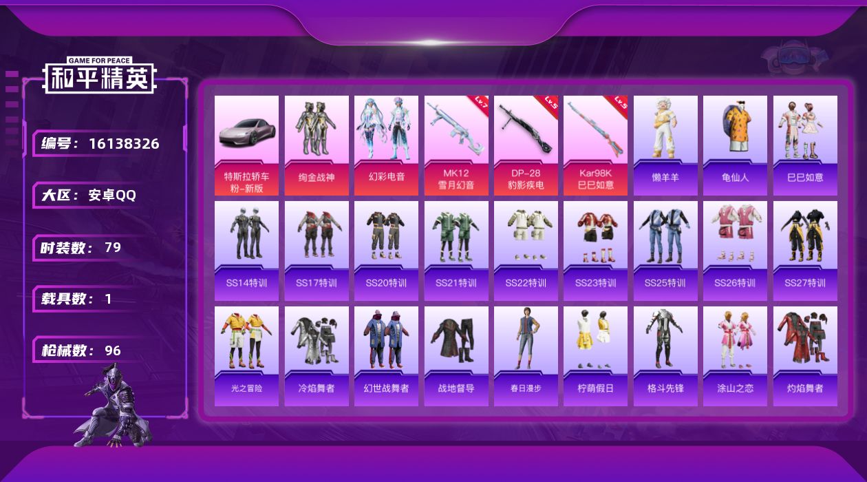 [16138326]【店主推荐捡漏号!可直接换绑】安卓 手Q-2粉装-3特效枪-1载具-2粉色飞行器-31009热力值-5王牌印记-79套装-96枪皮 【热门品类】:套装-龟仙人 【粉色套装】:粉装-绚金战神,粉装-幻彩电音 【粉色枪皮等级】:Kar98K-巳巳如意(五级),MK12-雪月幻音(七级),DP-28-豹影疾电(五级) 【粉色载具】:特斯拉Roadster(沁心粉) 【粉色枪皮】:Kar98K-巳巳如意,MK12-雪月幻音,DP-28-豹影疾电 【粉色飞行器】:赛博古神飞行器 【粉色降落伞】:绝对恒星降落伞,激战未来降落伞,梦幻舞会降落伞,忍者神龟降落伞,赛博古神降落伞,雪月幻音降落伞,冷漠罗丽降落伞,喜羊羊与灰太狼降落伞,炫彩糖果降落伞 【稀有套装】:套装-龟仙人,套装-巳巳如意,套装-雪国风尚,玩偶服-懒羊羊,套装-炫彩糖果 【稀有枪皮】:AUG-冰晶雪宝,AKM-夜灯,AKM-彩虹符号,AKM-破晓战魂,AKM-龙的传人,SCAR-L-炫彩节奏,SCAR-L-玉兔迎春,SCAR-L-红色方程式,M416-糯团青竹,M416-红色方程式,M416-蓝色火焰,GROZA-治愈之星,AUG-天降萌叽,AUG-耀粉歌者,M762-天降萌叽,M762-彩虹符号,AC-VAL-天降萌叽,蜜獾-天降萌叽,UZI-啾咪啾咪,UZI-天降萌叽,UZI-红色方程式,UMP45-夜灯,UMP45-生命誓言,UMP45-绒宝小鹅,Vector-治愈之星,Vector-香水柠檬,汤姆逊-耀粉歌者,P90-筑梦精灵,M24-治愈之星,SKS-糯团青竹,Mini14-涂山之恋,Mini14-炫彩节奏,Mini14-耀粉歌者,S686-红色方程式,S12K-破晓战魂,DBS-彩虹符号,M249-彩虹符号,M249-糯团青竹,DP-28-山经魅狐,DP-28-彩虹符号,MG3-幻世战舞者,MG3-第五大道,PKM-蜜语绒猫,沙漠之鹰-羲和光序,爆炸猎弓-炎氏战神,破片手榴弹-巳巳如意 【其他套装】:套装-SS14特训,套装-SS17特训,套装-SS20特训,套装-SS21特训,套装-SS22特训,套装-SS23特训,套装-SS25特训,套装-SS26特训,套装-SS27特训,套装-光之冒险,套装-冷焰舞者,套装-幻世战舞者,套装-战地督导,套装-春日漫步,套装-柠萌假日,套装-格斗先锋,套装-涂山之