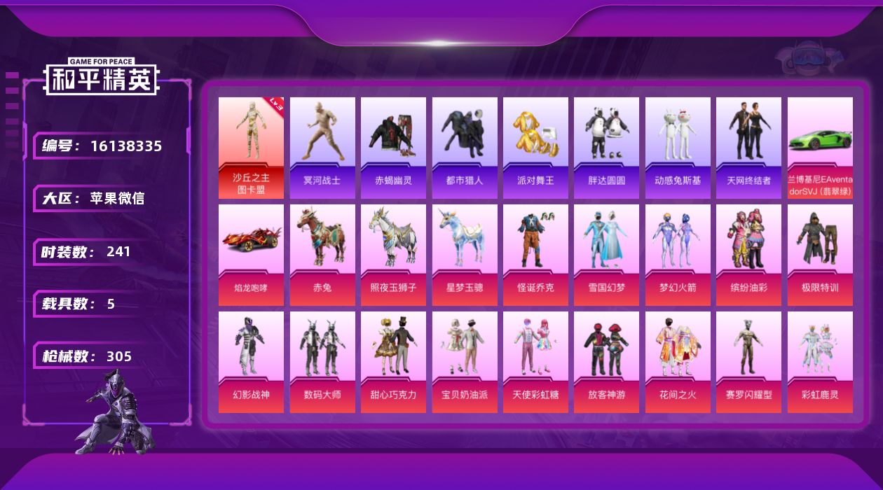 [16138335]【特价出售/店主推荐】苹果 微信-无敌战神框-1神装-23粉装-20特效枪-5载具-11粉色飞行器-121253热力值-12王牌印记-241套装-305枪皮