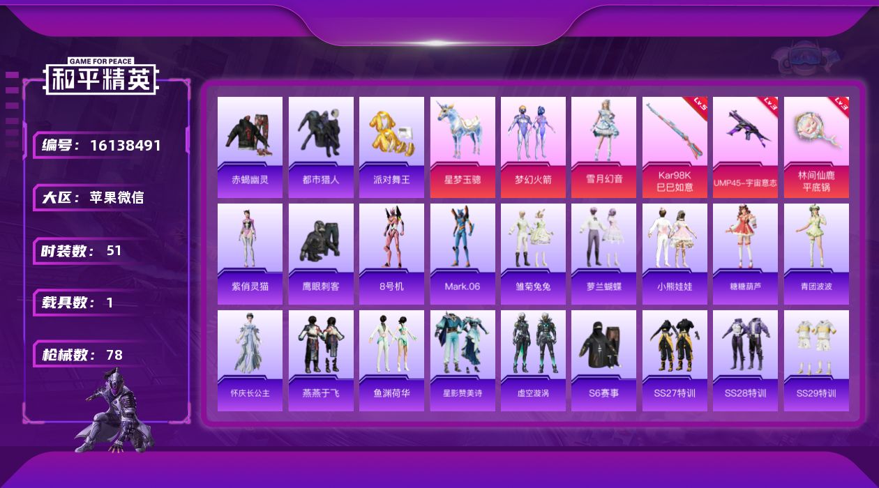 [16138491]都市赤蝎金鞋1010素材号!【特价出售/店主推荐】苹果 微信-2粉装-3特效枪-1载具-0粉色飞行器-23674热力值-3王牌印记-51套装-78枪皮 【热门品类】:粉装-梦幻火箭,套装-赤蝎幽灵,套装-都市猎人,套装-派对舞王,角色-8号机,角色-Mark.06 【粉色套装】:粉装-梦幻火箭,粉装-雪月幻音 【粉色枪皮等级】:UMP45-宇宙意志(三级),Kar98K-巳巳如意(五级),平底锅-林间仙鹿(三级) 【粉色载具】:星梦玉骢 【粉色枪皮】:UMP45-宇宙意志,Kar98K-巳巳如意,平底锅-林间仙鹿 【粉色降落伞】:梦幻火箭降落伞,沙丘之主降落伞,星梦奇缘降落伞,初号机 觉醒Ver.降落伞,金丰海韵降落伞 【稀有套装】:套装-雏菊兔兔,套装-萝兰蝴蝶,套装-小熊娃娃,套装-糖糖葫芦,套装-青团波波,角色-怀庆长公主,套装-燕燕于飞,套装-鱼渊荷华,套装-星影赞美诗,套装-虚空漩涡,角色-紫俏灵猫 【稀有枪皮】:AKM-影袭,SCAR-L-炫彩节奏,GROZA-影袭,AUG-天降萌叽,AUG-甜蜜菠萝,AUG-耀粉歌者,QBZ-绒兔团圆,M762-天降萌叽,G36C-镜域双华,UZI-影袭,UMP45-生命誓言,汤姆逊-环太平洋,P90-巳巳如意,Kar98K-影袭,Kar98K-梦幻火箭,Kar98K-星穹咏叹调,M24-影袭,Mini14-梦幻火箭,Mini14-炫彩节奏,Mini14-生命誓言,S686-未来战士,S686-巳巳如意,MG3-幻世战舞者,撬棍-沙丘之主权杖,破片手榴弹-巳巳如意 【其他套装】:套装-S6赛事,套装-SS27特训,套装-SS28特训,套装-SS29特训,套装-决胜时刻,套装-春日漫步,套装-活力之心,套装-猛禽,套装-破晓情侣,套装-竞技名士,套装-绮丽涂鸦,套装-鹤鸣,套装-鹰眼刺客,套装-冰冻风暴,套装-漫步者,套装-赤蝎幽灵,套装-纯真浪花,套装-热情海星,角色-粉雾星云,角色-极地流光,角色-8号机,角色-Mark.06,套装-湖畔霞光,套装-粉日山川 【稀有头盔】:梦幻火箭头盔(3级),梦幻火箭头盔(2级),梦幻火箭头盔(1级) 【稀有背包】:梦幻火箭背包(3级),梦幻火箭背包(2级),梦幻火箭背包(1级) 【营地ID】:403287528