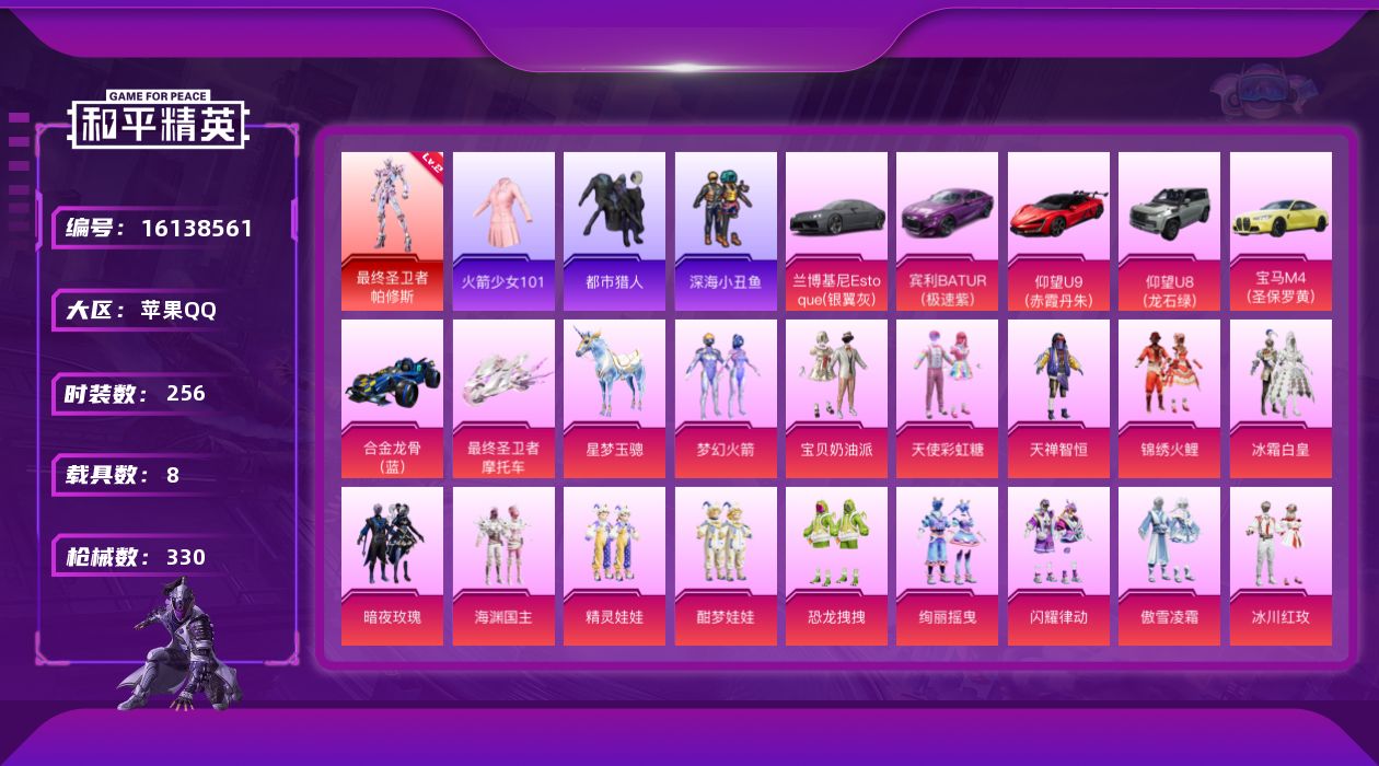 - PX_2096096- 苹果手Q-25王牌印记-有战神框-15粉装-7特效枪-3载具-114733热力值-283套装-318枪皮-2卓越印记-0传奇印记 【15粉装】,天使彩虹糖,洛天依,花间之火,极致幻想,暗夜玫瑰,复仇流浪者,幻彩马卡龙,桀骜红莲,彩虹鹿灵,山涧鹿灵,香水柠檬,幻影战神,数码大师,星之彼岸,齐天大圣 【7特效枪】AKM-炫紫旋律-7级 SCAR-L-机甲封神-5级 M416-心