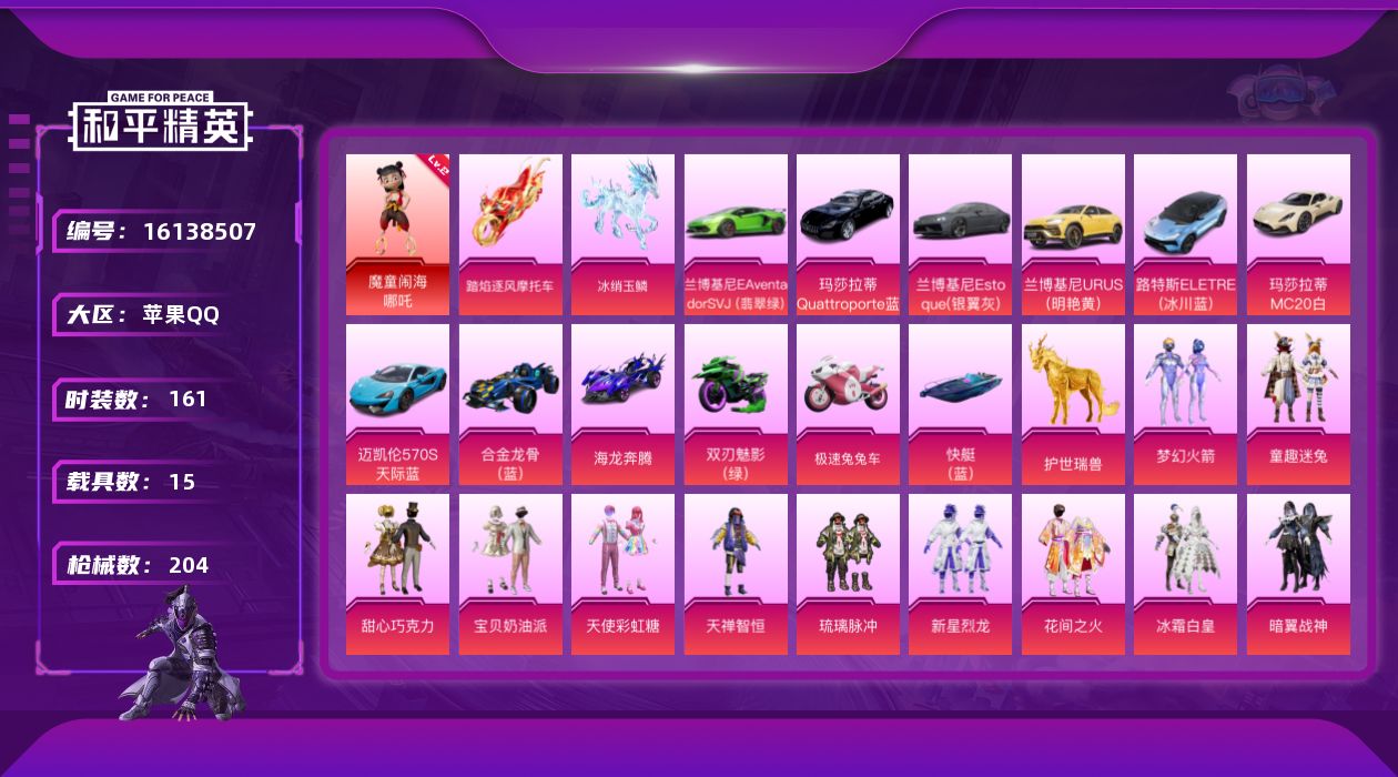 [16138507]【特价出售/店主推荐】苹果 手Q-1神装-36粉装-14特效枪-15载具-16粉色飞行器-101260热力值-7王牌印记-161套装-204枪皮