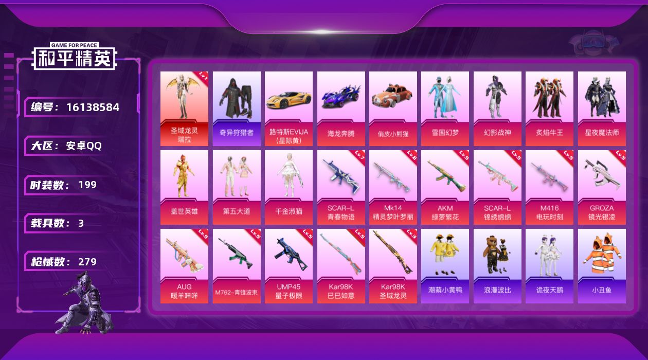 [16138584]安卓 手Q-1神装-7粉装-11特效枪-3载具-7粉色飞行器-94306热力值-18王牌印记-199套装-279枪皮