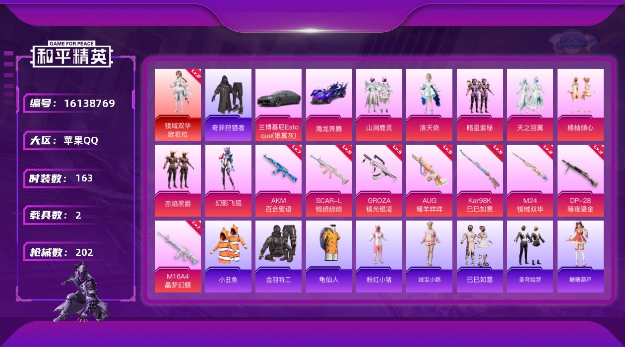 [16138769]【特价出售/店主推荐】 苹果 手Q-1神装-7粉装-8特效枪-2载具-5粉色飞行器-68173热力值-8王牌印记-163套装-202枪皮【红色神装等级】:镜域双华-欧若拉(二级)【红色角色神装】:镜域双华-欧若拉【热门品类】:套装-小丑鱼,套装-奇异狩猎者,套装-金羽特工,套装-龟仙人,套装-粉红小猪【粉色套装】:粉装-山涧鹿灵,角色-洛天依,粉装-暗星紫秘,粉装-天之羽翼,粉装-橘柚倾心,粉装-赤焰黑爵,粉装-幻影飞狐【粉色枪皮等级】:AKM-百合蜜语(七级),M16A4-晶梦幻蝶(一级),SCAR-L-锦绣绵绵(五级),GROZA-镜光银凌(五级),AUG-暖羊咩咩(五级),Kar98K-巳巳如意(五级),M24-镜域双华(三级),DP-28-暗夜鎏金(三级)【粉色载具】:兰博基尼Estoque(银翼灰),海龙奔腾【粉色枪皮】:AKM-百合蜜语,M16A4-晶梦幻蝶,SCAR-L-锦绣绵绵,GROZA-镜光银凌,AUG-暖羊咩咩,Kar98K-巳巳如意,M24-镜域双华,DP-28-暗夜鎏金【粉色飞行器】:天之羽翼飞行器,冷魅冰骑飞行器,千面幻镜飞行器,镜域双华-灵镜之阶,凤舞九天飞行器