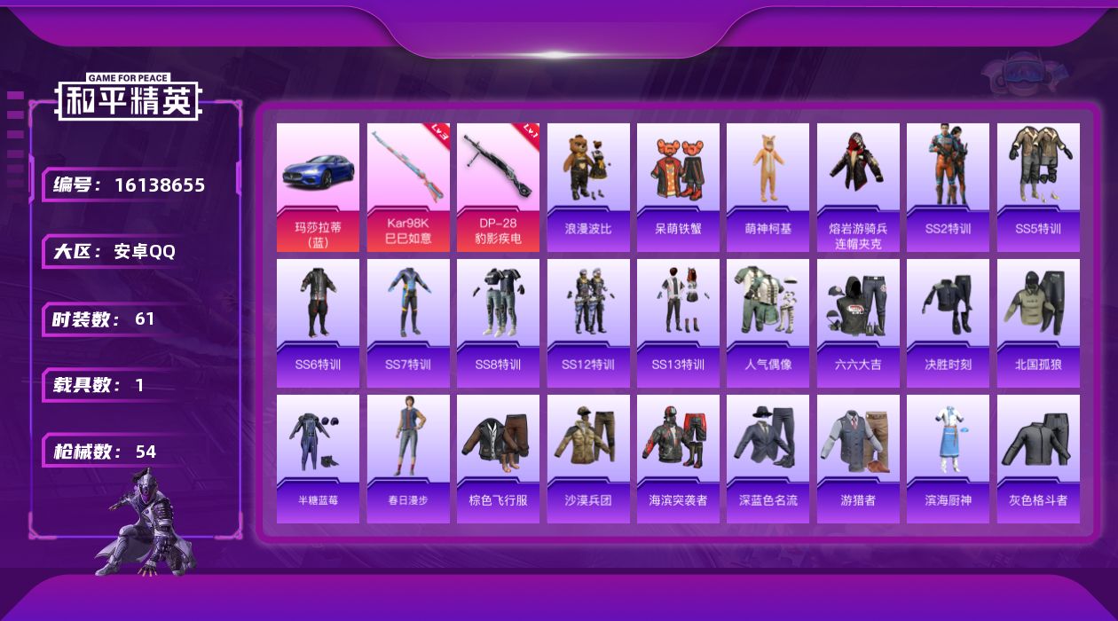 [16138655]【特价出售/店主推荐】安卓 手Q-0粉装-2特效枪-1载具-0粉色飞行器-16555热力值-2王牌印记-61套装-54枪皮 【热门品类】:套装-SS1特训,套装-浪漫波比,熔岩游骑兵连帽夹克 【粉色枪皮等级】:Kar98K-巳巳如意(三级),DP-28-豹影疾电(一级) 【粉色载具】:玛莎拉蒂Ghibli(蓝) 【粉色枪皮】:Kar98K-巳巳如意,DP-28-豹影疾电 【粉色降落伞】:天启纪元降落伞 【稀有枪皮】:AKM-冰凉西瓜,M16A4-凝视深渊,M16A4-生命誓言,M16A4-蓝色火焰,SCAR-L-炫彩节奏,SCAR-L-生命誓言,SCAR-L-红色方程式,SCAR-L-黄金龙骨,M416-红色方程式,M416-蓝色火焰,G36C-星穹咏叹调,UZI-天降萌叽,UZI-生命誓言,UZI-金风玉露,UMP45-夜灯,汤姆逊-勇闯险境,汤姆逊-幻影战神,P90-巳巳如意,Kar98K-勇闯险境,Kar98K-红色方程式,M24-冰封烈焰,SKS-勇闯险境,SKS-玉龙,Mini14-生命誓言,S686-冰封烈焰,S1897-勇闯险境,M249-破晓战魂,DP-28-彩虹符号,DP-28-清新柠檬,P92-雷霆特警,P1911-冰封烈焰,P18C-黄金龙骨,蝎式手枪-欢乐香蕉 【其他套装】:套装-SS2特训,套装-SS5特训,套装-SS6特训,套装-SS7特训,套装-SS8特训,套装-SS12特训,套装-SS13特训,套装-人气偶像,套装-六六大吉,套装-决胜时刻,套装-北国孤狼,套装-半糖蓝莓,套装-春日漫步,套装-棕色飞行服,套装-沙漠兵团,套装-海滨突袭者,套装-深蓝色名流,套装-游猎者,套装-滨海厨神,套装-灰色格斗者,套装-燃烧卡路里,套装-猛禽,套装-甜蜜告白,套装-疯狂小兔子,套装-登山爱好者,套装-破晓情侣,套装-竞技勇士朋克,套装-绯格组合,套装-荣耀,套装-蓝色运动,套装-跃动心情,套装-迎春赐吉,套装-霓虹街区,套装-黄色伏地魔,套装-黄色名流,套装-黑色伏地魔,套装-特战英豪,套装-刚毅裁决者,套装-苍穹猎鹰,套装-沙漠毒蛇,套装-漫步者,套装-甜蜜菠萝,套装-战地菁英,套装-派对绅士,套装-极地朋克,套装-午夜朋克,套装-呆萌铁蟹,套装-幻影公爵,套装-夜莺强袭者,套装-坚韧舞者,套装-凛冬战士,套装-雪山精英,套装-雪山征服者,