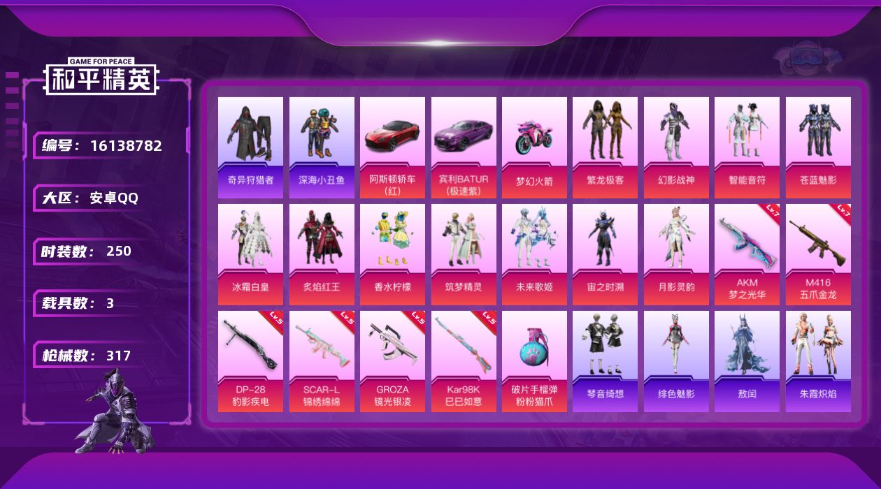 - [16334301]安卓 手Q-5粉装-5特效枪-0载具-0粉色飞行器-43120热力值-9王牌印记-103套装-149枪皮 【热门品类】:套装-龟仙人 【粉色套装】:粉装-新星烈龙,角色-复仇流浪者,角色-烟云彩露,角色-电磁星,粉装-星穹咏叹调 【粉色枪皮等级】:AKM-炫紫旋律(七级),M416-风花雪月(三级),Kar98K-巳巳如意(五级),MK12-雪月幻音(一级),DP-28-豹影疾电(一级) 【粉色枪皮】:AKM-炫紫旋律,M416-风花雪月,Kar98K-巳巳如意,MK12-雪月幻音,DP-28-豹影疾电 【粉色降落伞】:潮汐统领降落伞,恐龙拽拽降落伞,江南烟雨降落伞,精灵梦叶罗丽降落伞,金丰海韵降落伞,千金淑猫降落伞,星穹咏叹调降落伞,冷漠罗丽降落伞 【稀有套装】:套装-龟仙人,套装-巳巳如意,角色-临安公主,套装-粉恋花,套装-紫幽梦,套装-蓝冰羽,套装-星渊小夜曲,套装-云朵鹅,套装-雪绒豹,角色-时希公主 【稀有枪皮】:AKM-恐龙拽拽,AKM-江南烟雨,AKM-生命誓言,AKM-破晓战魂,AKM-虎虎生威,AKM-龙的传人,M16A4-幻世战舞者,M16A4-千金淑猫,SCAR-L-炫彩节奏,SCAR-L-玉兔迎春,SCAR-L-红色方程式,M416-糯团青竹,M416-红色方程式,M416-蓝色火焰,GROZA-恐龙拽拽,GROZA-马卡龙,AUG-天降萌叽,AUG-耀粉歌者,QBZ-原初圣火,QBZ-未来歌姬,QBZ-潮汐统领,QBZ-银碳小老虎,QBZ-飞驰魅影,M762-天降萌叽,M762-彩虹甜喵,M762-云朵鹅,AC-VAL-天降萌叽,AC-VAL-闲梦青缨,蜜獾-天降萌叽,蜜獾-娇憨猪猪,UZI-墨染幽兰,UZI-天降萌叽,UZI-娇憨猪猪,UZI-影袭,UZI-炫彩节奏,UZI-红色方程式,UMP45-夜灯,UMP45-生命誓言,UMP45-蓝色火焰,Vector-焰鹰斗篷,Vector-生命誓言,Vector-音爆索尼克,汤姆逊-天降萌叽,汤姆逊-庄周梦蝶,汤姆逊-炫彩节奏,汤姆逊-环太平洋,汤姆逊-耀粉歌者,AKS-74U-鬼刀,P90-飞驰魅影,P90-巳巳如意,Kar98K-彩虹符号,Kar98K-炫彩节奏,Kar98K-红色方程式,Kar98K-飞驰魅影,M24-影袭,M24-炫彩节奏,AWM-焰鹰斗篷,AWM-恐龙拽拽,SKS