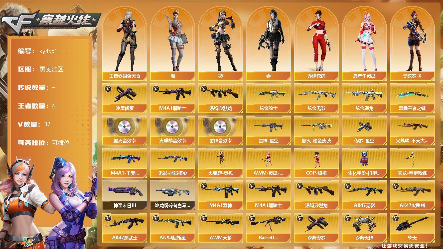 [16138816]黑龙江区-32V-4王者-3炫金 【热门武器】:M4A1-黑骑士,汤姆逊-烈龙,沙鹰-修罗*2 【王者炫金武器】:雷霆王者之锋,炫金骑士,炫金无影,炫金黑龙 【音效卡】:AK47-火麒麟音效卡,M4A1-雷神音效卡,Barrett-毁灭音效卡 【皮肤】:雷神-星空,火麒麟-平天大圣,毁灭耀金皮肤,M4A1-千变-孔明皮肤,无影-能量核心,修罗-星空 【角色】:零,葵,樱,王者-零-国色天香,乔伊教练,嘉年华灵狐,曼陀罗-X 【人偶武器】:火麒麟-灵狐,天龙-乔伊教练,AWM-灵狐-15周年嘉年华,COP-旗袍,生化手雷-机甲核心 【挑战大师】:冰龙粉碎者-白马银枪,神圣爆裂者-末日III 【英雄级武器】:AK47-火麒麟,M4A1-雷神,M4A1-黑骑士,AK47-无影,AK47-黑武士,AN94-超新星,M4A1-武圣,M4A1-龙血,黑武士-锦绣游龙,烈火-动感闪耀,王者之武-觉醒版,AWM-天龙,Barrett-毁灭,汤姆逊-烈龙,沙鹰-修罗*2,沙鹰-天神,Glock18-武圣,天神-动感闪耀,擎天,麒麟刺,屠龙-动感闪耀,高爆手雷-雷霆*2,手雷-动感闪耀,闪光弹-雷霆*2,烟雾弹-雷霆*2,烟雾弹-雷霆王者-觉醒版 【道具】:亚洲杯纪念炫彩背包,战舰背包,炫彩背包,救世主-黑桃战神,绿色巨人,灵魂忍者,迷雾幽灵,夺命之镰,防化服*2,金色流光-枪王排位*2,枪王排位28赛季金色流光,枪王排位29赛季金色流光,动感闪耀表情,防弹头盔*6,防弹衣*6,C4工具钳*6,手雷包*6 【特殊枪械】:1黑骑士,1烈龙