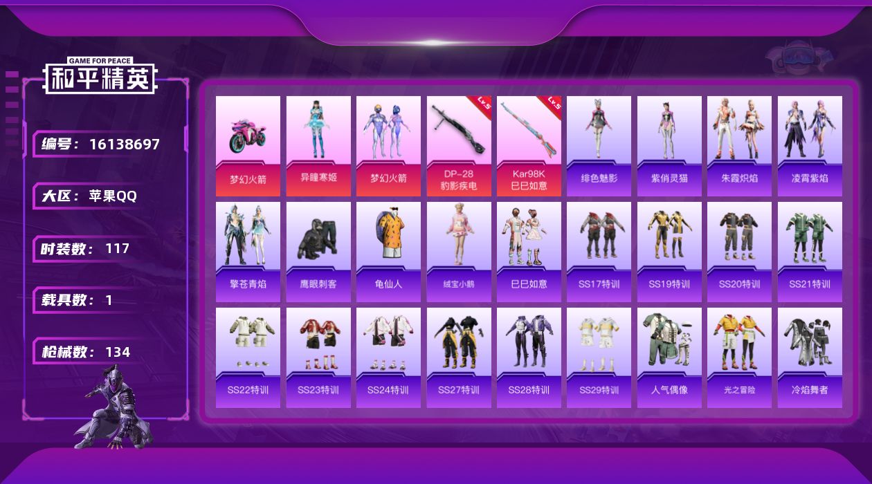 [16138697]【特价出售/店主推荐】苹果 手Q-2粉装-2特效枪-1载具-0粉色飞行器-39602热力值-9王牌印记-117套装-134枪皮