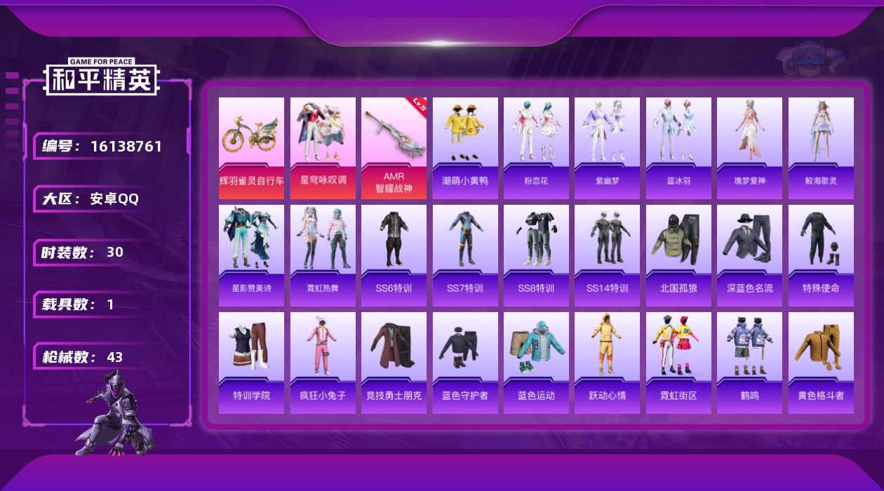 [16138761]【特价出售/店主推荐】安卓 手Q-1粉装-1特效枪-1载具-1粉色飞行器-12341热力值-1王牌印记-30套装-43枪皮【热门品类】:套装-潮萌小黄鸭【粉色套装】:粉装-星穹咏叹调【粉色枪皮等级】:AMR-智耀战神(五级)【粉色载具】:辉羽雀灵自行车【粉色枪皮】:AMR-智耀战神【粉色飞行器】:雀灵庇佑飞行器