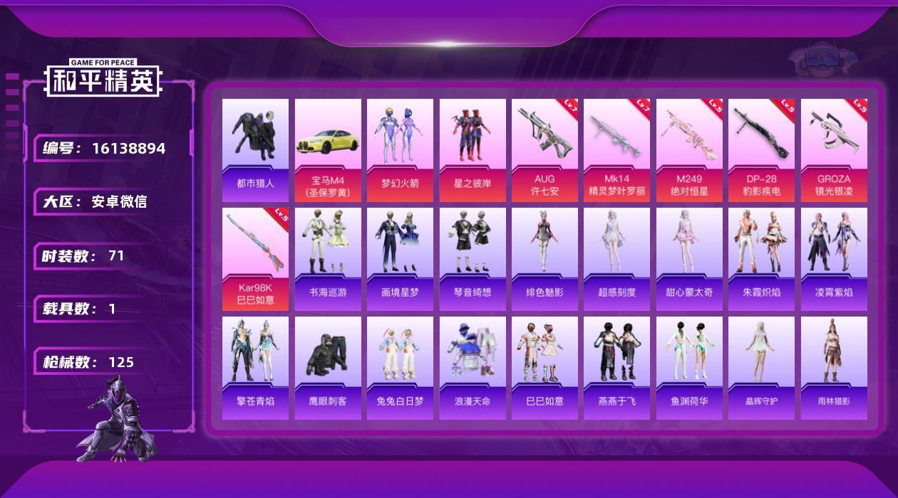 [16138894]【特价出售/店主推荐】安卓 微信-2粉装-6特效枪-1载具-4粉色飞行器-37668热力值-5王牌印记-71套装-125枪皮 【热门品类】:粉装-梦幻火箭,套装-浪漫天命,套装-都市猎人 【粉色套装】:粉装-梦幻火箭,粉装-星之彼岸 【粉色枪皮等级】:GROZA-镜光银凌(五级),AUG-许七安(七级),Kar98K-巳巳如意(五级),Mk14-精灵梦叶罗丽(七级),M249-绝对恒星(五级),DP-28-豹影疾电(五级) 【粉色载具】:宝马M4(圣保罗黄) 【粉色枪皮】:GROZA-镜光银凌,AUG-许七安,Kar98K-巳巳如意,Mk14-精灵梦叶罗丽,M249-绝对恒星,DP-28-豹影疾电 【粉色飞行器】:绝对恒星飞行器,时光之吻飞行器,时光之誓飞行器 【粉色降落伞】:绝对恒星降落伞,第五大道降落伞,精灵梦叶罗丽降落伞,墨龙九天降落伞,月影灵韵降落伞,智耀战神降落伞,幻彩电音降落伞,绯穹魔姬降落伞,异瞳寒姬降落伞,炫彩糖果降落伞 【稀有套装】:套装-巳巳如意,角色-超感刻度,角色-甜心蒙太奇,套装-雪国风尚,套装-燕燕于飞,套装-鱼渊荷华,套装-晶辉守护,套装-雨林猎影,套装-樱梦幻音,套装-粉恋花,套装-紫幽梦,套装-蓝冰羽,套装-星渊小夜曲,套装-彩虹兔,套装-云朵鹅,套装-雪绒豹,套装-蜜露汐语,套装-朱霞炽焰,套装-凌霄紫焰,套装-擎苍青焰,角色-绯色魅影,套装-书海巡游,套装-画境星梦,套装-琴音绮想,套装-炫彩糖果 【稀有枪皮】:AUG-冰晶雪宝,AKM-影袭,AKM-江南烟雨,AKM-玄冥寒域,SCAR-L-净心行者,M416-红色方程式,M416-蓝色火焰,GROZA-影袭,AUG-绝对恒星,M762-彩虹符号,M762-第五大道,M762-云朵鹅,M762-登顶巅峰,蜜獾-青瓷战姬,ACE32-画境星梦,ARX-凌霄紫焰,UZI-啾咪啾咪,UZI-影袭,UMP45-极意拳锋,Vector-生命誓言,汤姆逊-智耀战神,MP5K-画境星梦,JS9-凌霄紫焰,P90-巳巳如意,Kar98K-梦幻火箭,M24-影袭,AWM-黄金龙骨,AWM-暮色玫影,MK20-H-樱桃泡泡,SVD-云朵鹅,M1加兰德-画境星梦,S686-巳巳如意,S12K-玩趣呆呆,AA12-G-绒兔团圆,AA12-G-画境星梦,SPAS-12-云朵鹅,M249-彩虹符号,M2