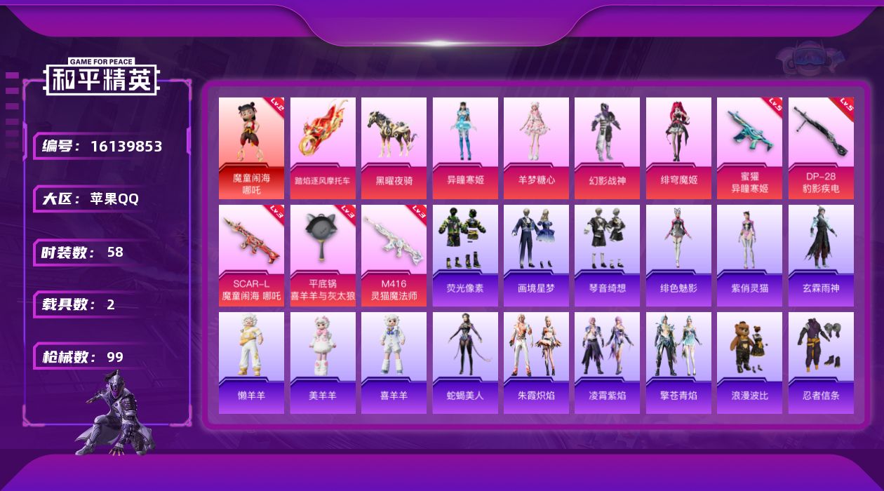 [16139853]【店主推荐捡漏号】苹果 手Q-1神装-4粉装-6特效枪-2载具-3粉色飞行器-32136热力值-3王牌印记-58套装-99枪皮【红色神装等级】:魔童闹海-哪吒(二级)【红色角色神装】:魔童闹海-哪吒【热门品类】:套装-忍者信条,套装-浪漫波比【粉色套装】:粉装-幻影战神,角色-绯穹魔姬,角色-羊梦糖心,角色-异瞳寒姬【粉色枪皮等级】:SCAR-L-魔童闹海 哪吒(三级),M416-灵猫魔法师(三级),蜜獾-异瞳寒姬(五级),AKS-74U-森灵之息(五级),DP-28-豹影疾电(五级),平底锅-喜羊羊与灰太狼(三级)【粉色载具】:踏焰逐风摩托车,黑曜夜骑【粉色枪皮】:SCAR-L-魔童闹海 哪吒,M416-灵猫魔法师,蜜獾-异瞳寒姬,AKS-74U-森灵之息,DP-28-豹影疾电,平底锅-喜羊羊与灰太狼