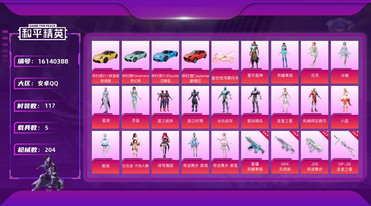 [16140388]【店主推荐捡漏号!可直接换绑】安卓 手Q-18粉装-13特效枪-5载具-9粉色飞行器-7.7w热力值-10王牌印记-117套装-204枪皮 【热门品类】:角色-忠真马岱,角色-忠义严颜,套装-龟仙人,角色-8号机,角色-Mark.06,大砍刀-青龙偃月刀,撬棍-龙胆亮银枪 【粉色套装】:粉装-星之彼岸,角色-宙之时溯,角色-冰炎战车,角色-紫钛骑兵,角色-圣堂之誓,粉装-机械师花傲天,角色-小蓝,角色-美琪,角色-狂花道·不知火舞,角色-绯穹魔姬,角色-奇迹舞步 美琪,角色-奇迹舞步 美雪,角色-花灵,角色-冰魄,角色-星渊,角色-灵玺,角色-异瞳寒姬,角色-震天雷神 【粉色枪皮等级】:AKM-绿萝繁花(五级),SCAR-L-彩装战姬(五级),M416-电玩时刻(五级),GROZA-无垠阁(三级),AUG-暖羊咩咩(五级),蜜獾-异瞳寒姬(七级),ARX-无垠阁(七级),UMP45-量子极限(五级),JS9-奇迹舞步(七级),Kar98K-巳巳如意(五级),M24-镜域双华(三级),DP-28-圣堂之誓(七级),DP-28-豹影疾电(五级) 【粉色载具】:保时捷911 敞篷版(极速黄),保时捷Panamera(梦幻青),保时捷918 Spyder(沉静蓝),保时捷Cayenne(激情红),盛世惊鸿摩托车,僚机-萌兔起飞 【粉色枪皮】:AKM-绿萝繁花,SCAR-L-彩装战姬,M416-电玩时刻,GROZA-无垠阁,AUG-暖羊咩咩,蜜獾-异瞳寒姬,ARX-无垠阁,UMP45-量子极限,JS9-奇迹舞步,Kar98K-巳巳如意,M24-镜域双华,DP-28-圣堂之誓,DP-28-豹影疾电 【粉色飞行器】:天之羽翼飞行器,沙丘之主天马,繁龙极客飞行器,镜域双华-灵镜之阶,龙翔九天飞行器,奇迹舞步飞行器,无垠阁飞行器,天象三御飞行器 【粉色降落伞】:梦幻火箭降落伞,星之彼岸降落伞,闲梦青缨降落伞,莲影清波降落伞,沙丘之主降落伞,小叽联名款降落伞,繁龙极客降落伞,江南烟雨降落伞,巴啦啦小魔仙降落伞,霓虹漫游降落伞,精灵梦叶罗丽降落伞,鸢尾晶梦降落伞,忍者神龟降落伞,临安公主降落伞,鬼刀降落伞,智耀战神降落伞,冷漠罗丽降落伞,奇迹舞步降落伞,异瞳寒姬降落伞,天象三御降落伞,炫彩糖果降落伞 【稀有套装】:套装-龟仙人,套装-巳巳如意,套装-雏菊兔兔,套装-萝兰蝴蝶,套装-小熊