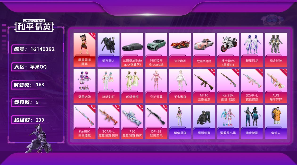 [16140392]【特价出售/店主推荐】苹果 手Q-1神装-7粉装-8特效枪-5载具-5粉色飞行器-8.3w热力值-17王牌印记-163套装-239枪皮