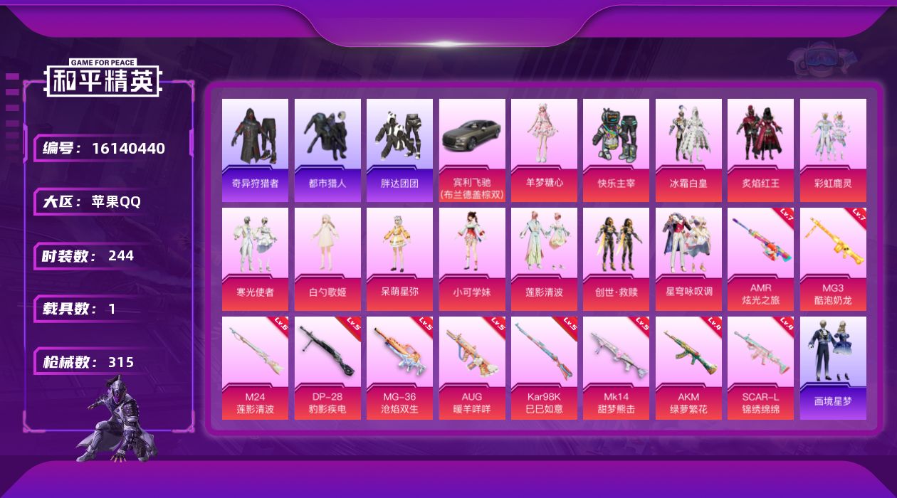 [16140440]【特价出售/店主推荐】地铁满天赋 苹果 手Q-无敌战神框-12粉装-10特效枪-1载具-7粉色飞行器-96842热力值-12王牌印记-244套装-315枪皮【热门品类】:套装-浪漫天命,套装-都市猎人,套装-小丑鱼,套装-奇异狩猎者,套装-胖达团团,角色-2B战斗服款,套装-龟仙人,套装-潮萌小黄鸭,套装-暗影哥特【粉色套装】:粉装-快乐主宰,粉装-冰霜白皇,粉装-炙焰红王,粉装-彩虹鹿灵,粉装-寒光使者,角色-白勺歌姬,角色-呆萌星弥,角色-小可学妹,粉装-莲影清波,套装-创世·救赎,粉装-星穹咏叹调,角色-羊梦糖心【粉色枪皮等级】:AKM-绿萝繁花(四级),SCAR-L-锦绣绵绵(四级),AUG-暖羊咩咩(五级),Kar98K-巳巳如意(五级),M24-莲影清波(六级),Mk14-甜梦熊击(五级),AMR-炫光之旅(七级),DP-28-豹影疾电(五级),MG3-酷泡奶龙(七级),MG-36-沧焰双生(五级)【粉色载具】:宾利飞驰(布罗德盖棕双色)【粉色枪皮】:AKM-绿萝繁花,SCAR-L-锦绣绵绵,AUG-暖羊咩咩,Kar98K-巳巳如意,M24-莲影清波,Mk14-甜梦熊击,AMR-炫光之旅,DP-28-豹影疾电,MG3-酷泡奶龙,MG-36-沧焰双生【粉色飞行器】:相思残雪飞行器,白勺歌姬飞行器,镜域双华-灵镜之阶,龙翔九天飞行器,圣域金龙飞行器,雀灵庇佑飞行器