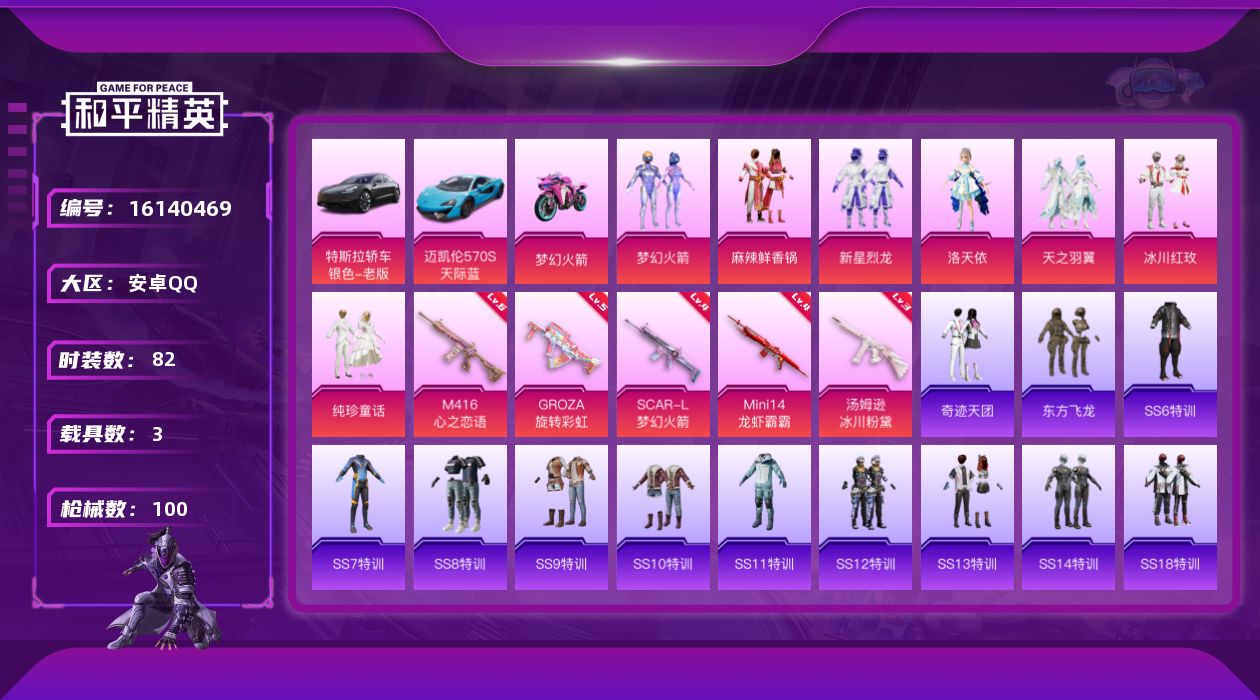 [16140469]【店主推荐捡漏号!可直接换绑】安卓 手Q-7粉装-5特效枪-3载具-2粉色飞行器-39776热力值-1王牌印记-82套装-100枪皮 【热门品类】:粉装-梦幻火箭 【粉色套装】:粉装-梦幻火箭,粉装-麻辣鲜香锅,粉装-新星烈龙,角色-洛天依,粉装-天之羽翼,粉装-冰川红玫,粉装-纯珍童话 【粉色枪皮等级】:SCAR-L-梦幻火箭(四级),M416-心之恋语(六级),GROZA-旋转彩虹(五级),汤姆逊-冰川粉黛(三级),Mini14-龙虾霸霸(四级) 【粉色载具】:特斯拉Model 3(冷光银),迈凯伦570S(天际蓝),双人摩托-梦幻火箭 【粉色枪皮】:SCAR-L-梦幻火箭,M416-心之恋语,GROZA-旋转彩虹,汤姆逊-冰川粉黛,Mini14-龙虾霸霸 【粉色飞行器】:梦幻火箭飞行器,天之羽翼飞行器 【粉色降落伞】:深海曼妙降落伞,梦幻火箭降落伞,龙虾霸霸降落伞,炫紫旋律降落伞,心之恋语降落伞,王牌四分卫降落伞,洛神天依降落伞,天之羽翼降落伞,旋转彩虹降落伞,冰川粉黛降落伞 【稀有枪皮】:AKM-夜灯,AKM-星之信仰,AKM-春暖花开,AKM-灼热熔岩,AKM-破晓战魂,M16A4-龙虾霸霸,M416-夜灯,GROZA-异彩先驱,GROZA-春暖花开,GROZA-治愈之星,GROZA-生命誓言,GROZA-田园牧歌,GROZA-黑色刀锋,AUG-天降萌叽,AUG-耀粉歌者,QBZ-彩虹符号,QBZ-洛神天依,M762-彩虹甜喵,M762-深海曼妙,M762-牛气冲天,Mk47-洛神天依,AC-VAL-天降萌叽,蜜獾-娇憨猪猪,UZI-娇憨猪猪,UMP45-生命誓言,Vector-夜灯,Vector-彩虹符号,Vector-治愈之星,Vector-生命誓言,Vector-田园牧歌,Vector-黑色刀锋,Vector-龙虾霸霸,汤姆逊-勇闯险境,汤姆逊-奇异狩猎者,汤姆逊-异彩先驱,汤姆逊-耀粉歌者,MP5K-异彩先驱,Kar98K-勇闯险境,Kar98K-彩虹符号,Kar98K-梦幻火箭,Kar98K-洛神天依,M24-治愈之星,SKS-勇闯险境,SKS-天之羽翼,SKS-心之恋语,VSS-田园牧歌,VSS-黑色刀锋,Mini14-异彩先驱,Mini14-旋转彩虹,Mini14-春暖花开,Mini14-梦幻火箭,Mini14-耀粉歌者,Mini14-金鼠