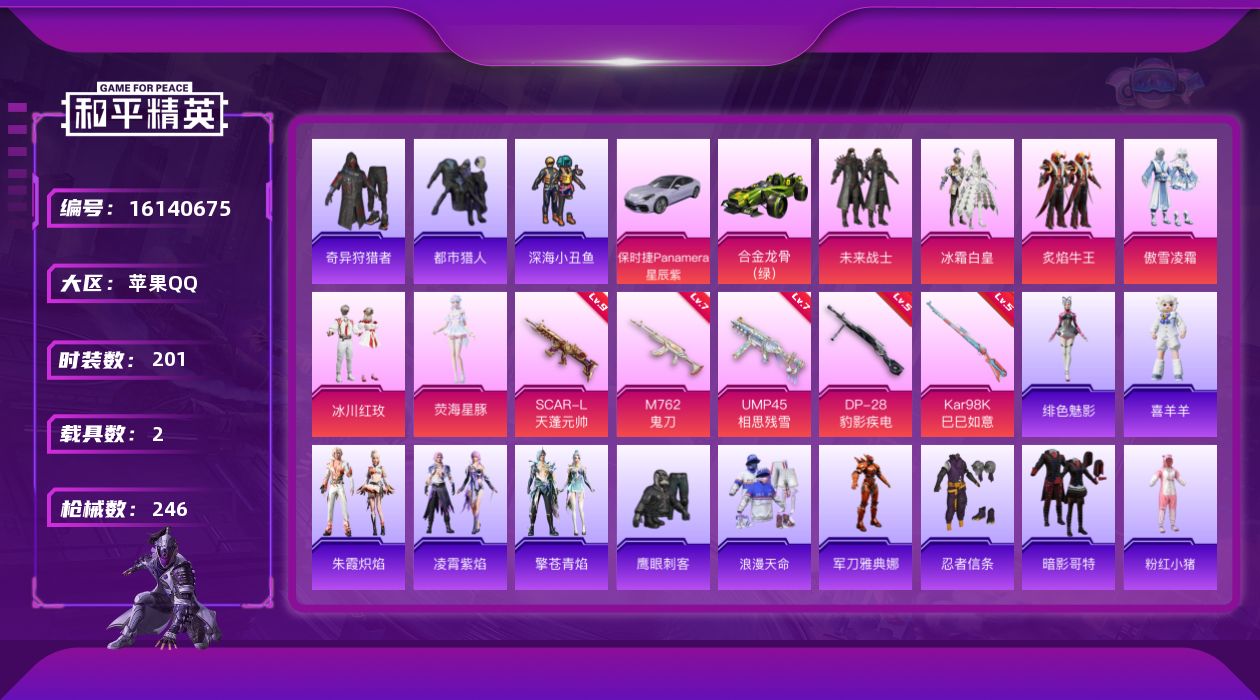 [16140675]【店主推荐捡漏号!可直接换绑】地铁满天赋苹果 手Q-无敌战神框-6粉装-5特效枪-2载具-2粉色飞行器-76715热力值-13王牌印记-201套装-246枪皮【热门品类】:套装-浪漫天命,套装-都市猎人,套装-深海小丑鱼,套装-奇异狩猎者,角色-军刀雅典娜,套装-忍者信条,套装-PeRo战队服,套装-暗影哥特,套装-粉红小猪,M416-星际漫游【粉色载具】:保时捷Panamera(星辰紫),合金龙骨(绿)【粉色套装】:粉装-未来战士,粉装-冰霜白皇,粉装-炙焰牛王,粉装-傲雪凌霜,粉装-冰川红玫,角色-荧海星豚【粉色枪皮等级】:SCAR-L-天蓬元帅(九级),M762-鬼刀(七级),UMP45-相思残雪(七级),Kar98K-巳巳如意(五级),DP-28-豹影疾电(五级)【粉色枪皮】:SCAR-L-天蓬元帅,M762-鬼刀,UMP45-相思残雪,Kar98K-巳巳如意,DP-28-豹影疾电【粉色飞行器】:王牌四分卫飞行器,庄周梦蝶飞行器