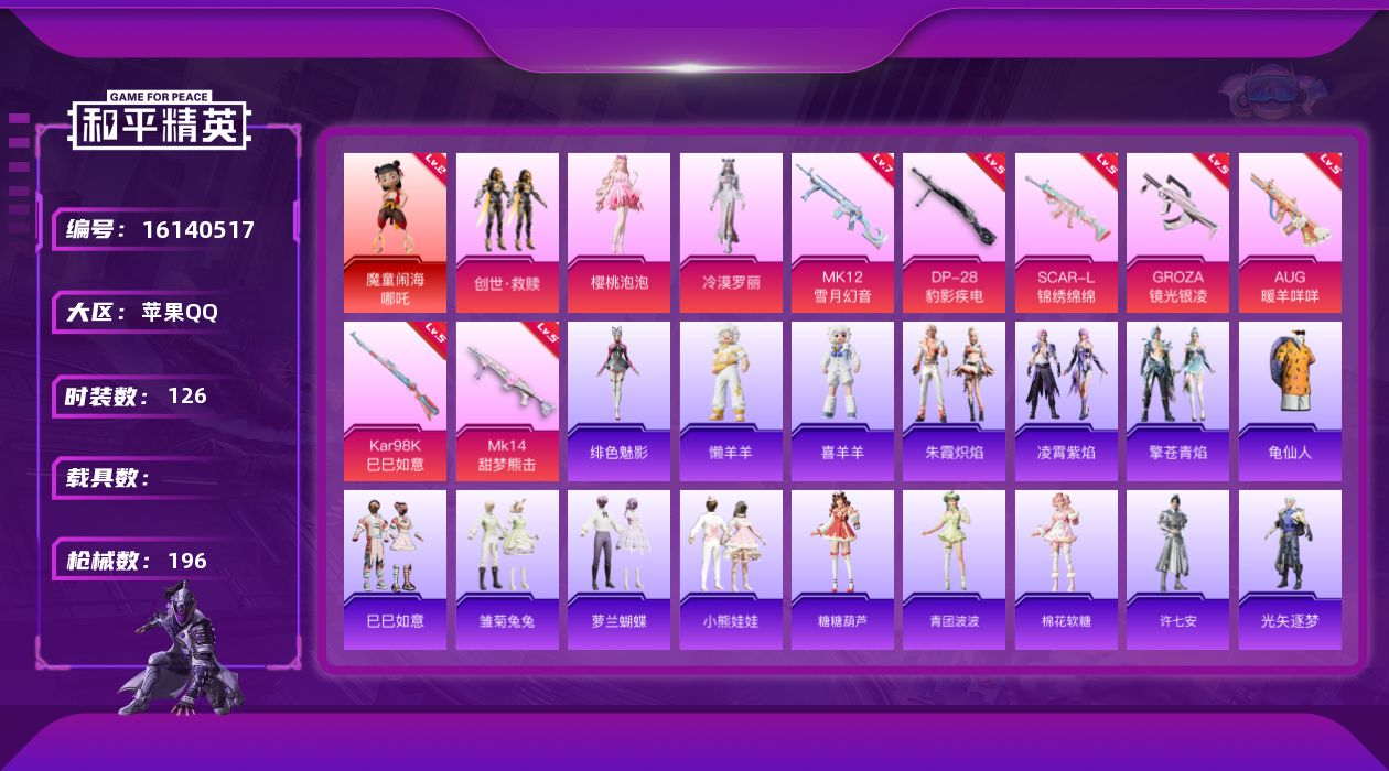 [16140517]【店主推荐捡漏号!可直接换绑】苹果 手Q-1神装-3粉装-7特效枪-0载具-3粉色飞行器-57447热力值-11王牌印记-126套装-196枪皮【红色神装等级】:魔童闹海-哪吒(二级)【红色角色神装】:魔童闹海-哪吒【热门品类】:套装-龟仙人【粉色套装】:套装-创世·救赎,角色-樱桃泡泡,角色-冷漠罗丽【粉色枪皮等级】:SCAR-L-锦绣绵绵(五级),GROZA-镜光银凌(五级),AUG-暖羊咩咩(五级),Kar98K-巳巳如意(五级),Mk14-甜梦熊击(五级),MK12-雪月幻音(七级),DP-28-豹影疾电(五级)【粉色枪皮】:SCAR-L-锦绣绵绵,GROZA-镜光银凌,AUG-暖羊咩咩,Kar98K-巳巳如意,Mk14-甜梦熊击,MK12-雪月幻音,DP-28-豹影疾电【粉色飞行器】:智趣喵喵飞行器,极意拳锋飞行器