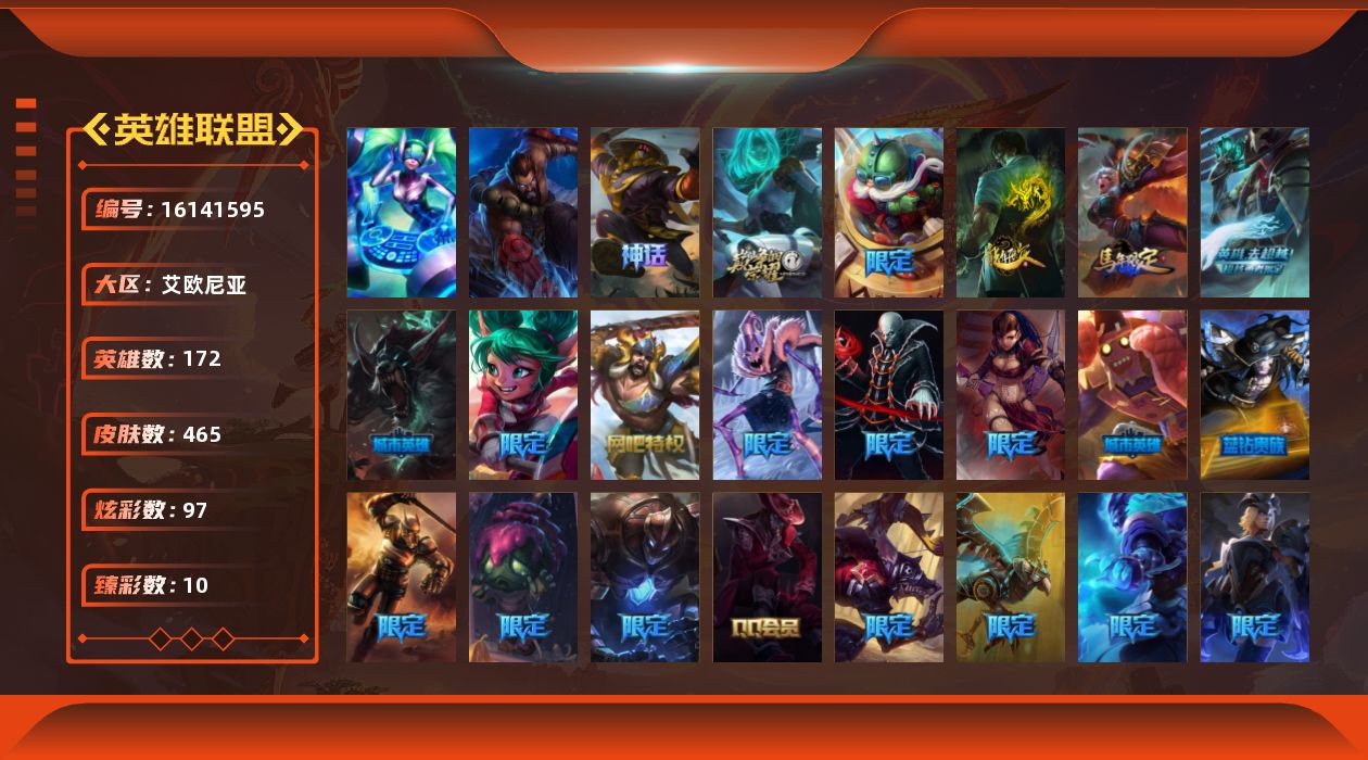 [16141595]【店主推荐捡漏号】青铜段位-172英雄-465皮肤-97炫彩-2终极-2神话-71限定-37传说-110史诗