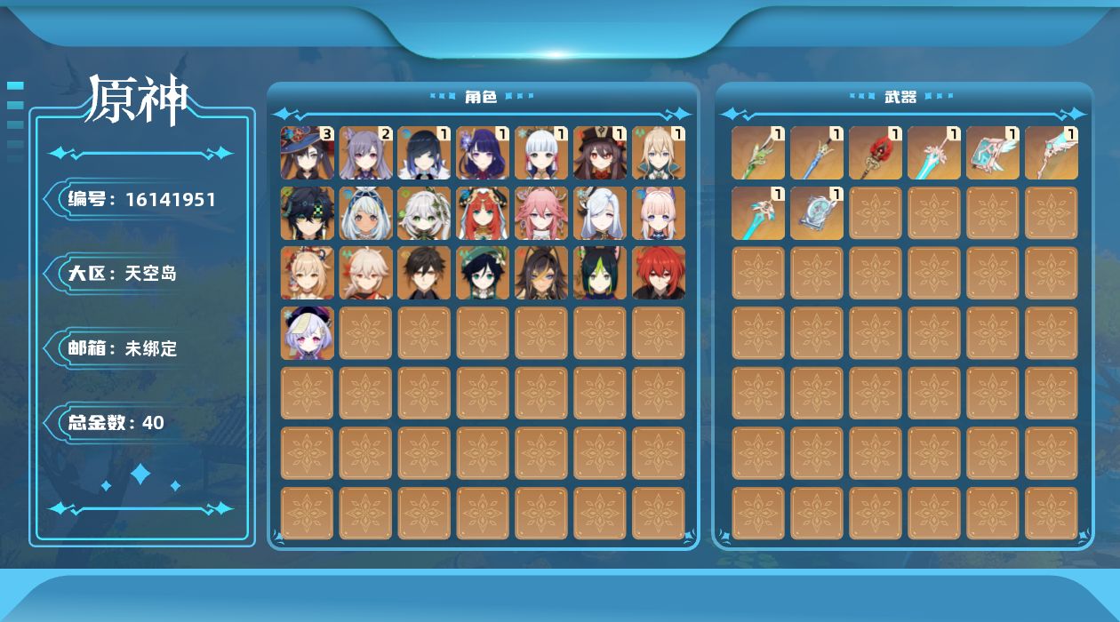 0命迪希雅,0命纳西妲,0命妮露,0命提纳里,1命夜兰,0命八重神子,0命申鹤,1命雷电将军,0命枫原万叶,1命神里绫华,0命钟离,1命胡桃,0命宵宫,0命温迪,0命珊瑚宫心海,2命刻晴,0命七七,1命琴,3命莫娜,0命迪卢克,0命基尼奇,0命玛拉妮,精1裁叶萃光,精1苍古自由之誓,精1护摩之杖,精1四风原典,精1天空之翼,精1天空之刃,精1天空之卷,精1天空之傲