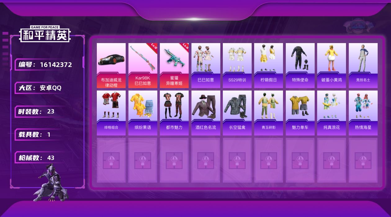 [16142372]【店主推荐捡漏号!可直接换绑】安卓 手Q-0粉装-2特效枪-1载具-1粉色飞行器-10737热力值-1王牌印记-23套装-43枪皮 【粉色枪皮等级】:蜜獾-异瞳寒姬(四级),Kar98K-巳巳如意(五级) 【粉色载具】:布加迪威龙(律动橙) 【粉色枪皮】:蜜獾-异瞳寒姬,Kar98K-巳巳如意 【粉色降落伞】:创世·救赎降落伞,炫彩糖果降落伞 【稀有套装】:套装-巳巳如意,套装-炫彩糖果 【稀有枪皮】:AUG-冰晶雪宝,AKM-破晓战魂,AKM-玄冥寒域,SCAR-L-炫彩节奏,M416-红色方程式,AUG-耀粉歌者,M762-天降萌叽,AC-VAL-天降萌叽,UZI-天降萌叽,Vector-生命誓言,Vector-创世·救赎,汤姆逊-天降萌叽,AKS-74U-鬼刀,Kar98K-红色方程式,S686-生命誓言,S12K-幻世战舞者,M249-破晓战魂,DP-28-彩虹符号,MG3-幻世战舞者 【其他套装】:套装-SS29特训,套装-柠萌假日,套装-特殊使命,套装-破蛋小黄鸡,套装-竞技名士,套装-绯格组合,套装-缤纷果语,套装-都市魅力,套装-酒红色名流,套装-长空猛禽,套装-青玉碎影,套装-魅力单车,套装-纯真浪花,套装-热情海星 【营地ID】:979925537