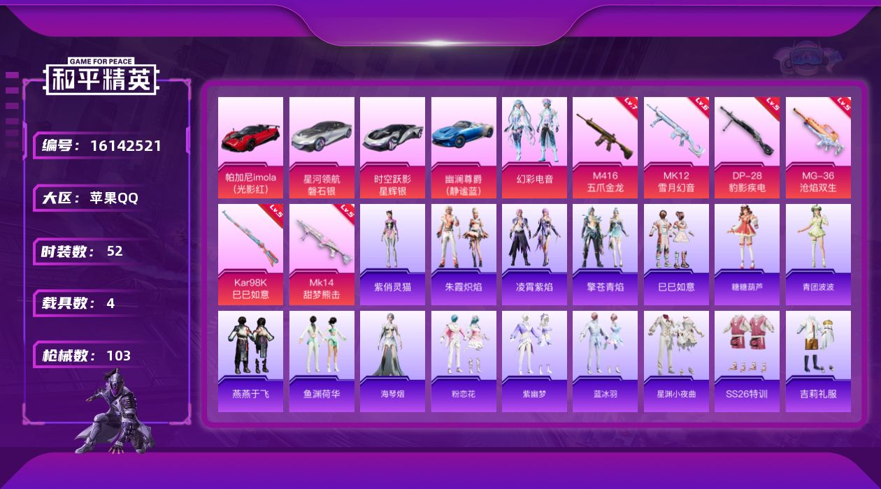 [16142521]【店主推荐捡漏号!可直接换绑】苹果 手Q-1粉装-6特效枪-4载具-2粉色飞行器-32930热力值-5王牌印记-52套装-103枪皮【粉色套装】:粉装-幻彩电音【粉色枪皮等级】:M416-五爪金龙(七级),Kar98K-巳巳如意(五级),Mk14-甜梦熊击(五级),MK12-雪月幻音(六级),DP-28-豹影疾电(五级),MG-36-沧焰双生(五级)【粉色载具】:帕加尼imola(光影红),星河领航(磐石银),时空跃影(星辉银),幽澜尊爵(静谧蓝)【粉色枪皮】:M416-五爪金龙,Kar98K-巳巳如意,Mk14-甜梦熊击,MK12-雪月幻音,DP-28-豹影疾电,MG-36-沧焰双生【粉色飞行器】:墨金战记飞行器