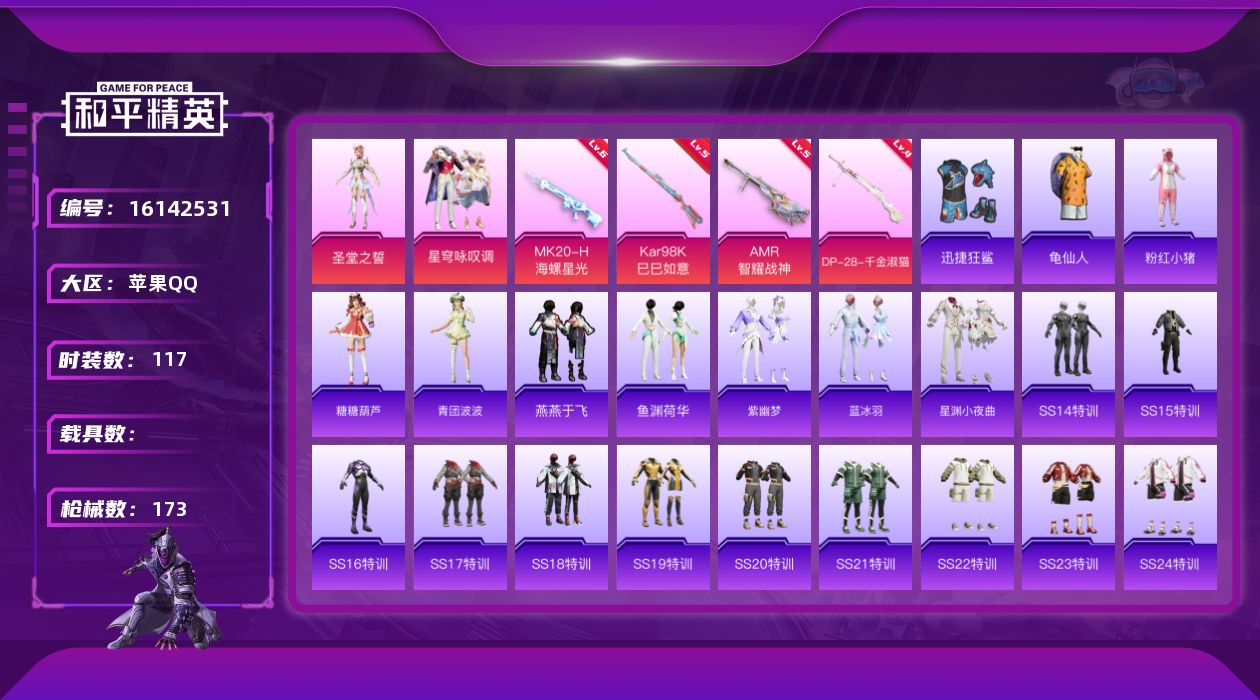 [16142531]【店主推荐捡漏号!可直接换绑】苹果 手Q-2粉装-4特效枪-0载具-1粉色飞行器-47138热力值-12王牌印记-117套装-173枪皮【热门品类】:套装-龟仙人,套装-粉红小猪【粉色套装】:角色-圣堂之誓,粉装-星穹咏叹调【粉色枪皮等级】:Kar98K-巳巳如意(五级),AMR-智耀战神(五级),MK20-H-海螺星光(六级),DP-28-千金淑猫(四级)【粉色枪皮】:Kar98K-巳巳如意,AMR-智耀战神,MK20-H-海螺星光,DP-28-千金淑猫【粉色飞行器】:星之彼岸飞行器