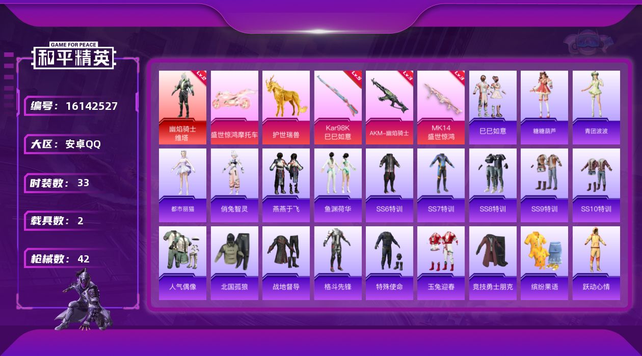 [16142527]【店主推荐捡漏号!可直接换绑】安卓 手Q-1神装-0粉装-3特效枪-2载具-5粉色飞行器-19404热力值-2王牌印记-33套装-42枪皮【红色神装等级】:幽焰骑士-维塔(二级)【红色角色神装】:幽焰骑士-维塔【粉色枪皮等级】:AKM-幽焰骑士(三级),Kar98K-巳巳如意(五级),Mk14-盛世惊鸿(三级)【粉色载具】:盛世惊鸿摩托车,护世瑞兽【粉色枪皮】:AKM-幽焰骑士,Kar98K-巳巳如意,Mk14-盛世【粉色飞行器】:酣梦熊熊飞行器,龙翔九天飞行器,幽焰列车飞行器,凤舞九天飞行器