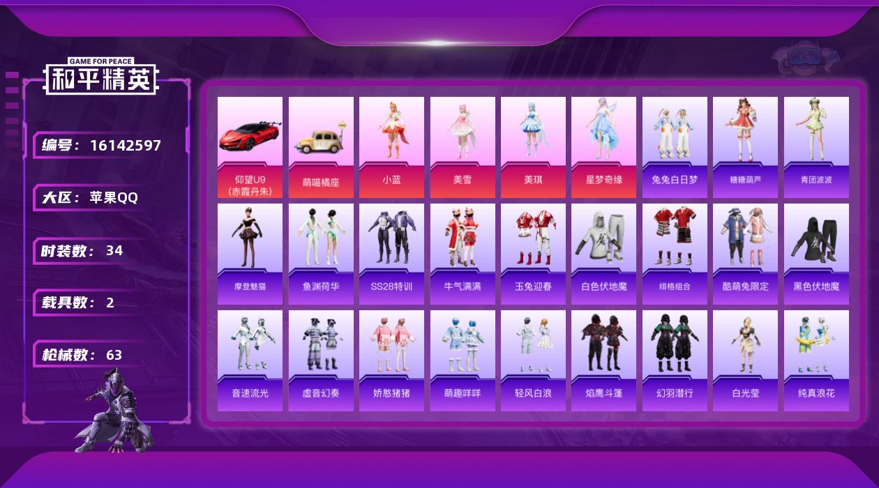 [16142597]【特价出售/店主推荐】苹果 手Q-4粉装-0特效枪-2载具-1僚机-1粉色飞行器-19881热力值-1王牌印记-34套装-63枪皮