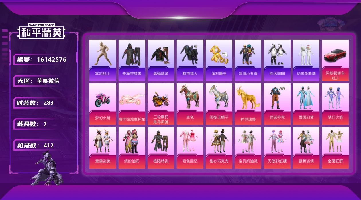 [16142576]【特价出售/店主推荐】苹果 微信-无敌战神框-33粉装-31特效枪-7载具-5粉色飞行器-156348热力值-21王牌印记-283套装-412枪皮