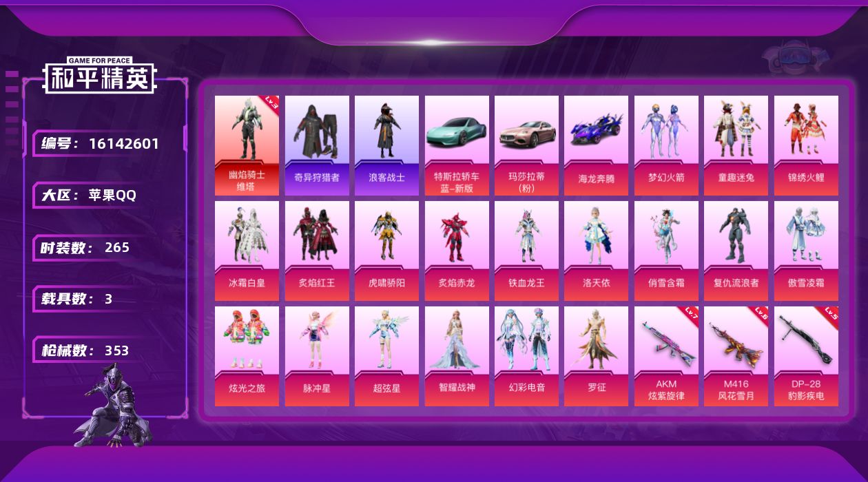 [16142601]【特价出售/店主推荐】苹果 手Q-1神装-18粉装-9特效枪-3载具-1僚机-7粉色飞行器-122961热力值-6王牌印记-265套装-353枪皮
