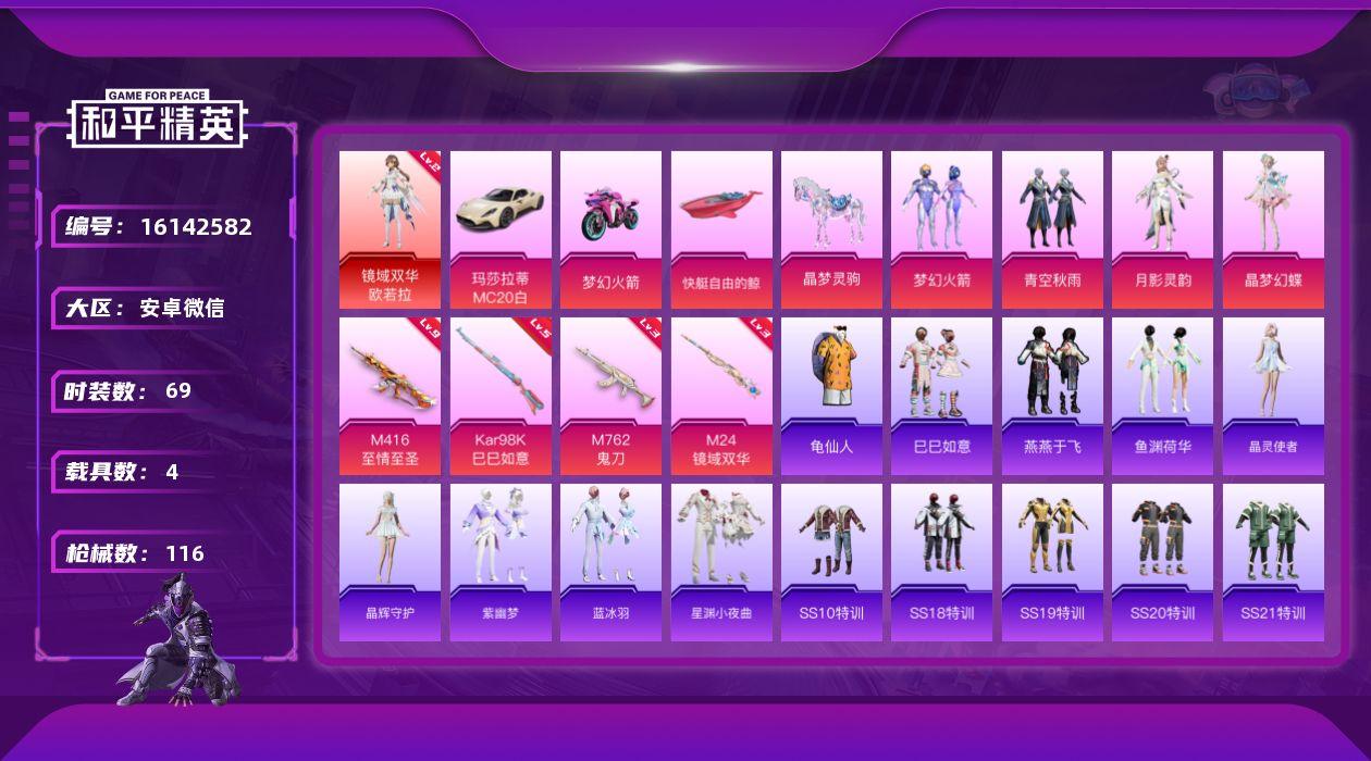 [16142582]可二次【特价出售/店主推荐】安卓 微信-1神装-4粉装-4特效枪-4载具-2粉色飞行器-43370热力值-9王牌印记-69套装-116枪皮 【红色神装等级】:镜域双华-欧若拉(二级) 【红色角色神装】:镜域双华-欧若拉 【热门品类】:粉装-梦幻火箭,套装-龟仙人 【粉色套装】:粉装-梦幻火箭,粉装-青空秋雨,角色-月影灵韵,角色-晶梦幻蝶 【粉色枪皮等级】:M416-至情至圣(九级),M762-鬼刀(三级),Kar98K-巳巳如意(五级),M24-镜域双华(三级) 【粉色载具】:玛莎拉蒂MC20(星石白),双人摩托-梦幻火箭,快艇-自由的鲸,晶梦灵驹 【粉色枪皮】:M416-至情至圣,M762-鬼刀,Kar98K-巳巳如意,M24-镜域双华 【粉色飞行器】:梦幻火箭飞行器,镜域双华-灵镜之阶 【粉色降落伞】:梦幻火箭降落伞,环太平洋降落伞,垂柳戏鸭降落伞,彩虹甜喵降落伞,暗夜鎏金降落伞,仲夏莫吉托降落伞,镜域双华降落伞,晶梦幻蝶降落伞 【稀有套装】:套装-龟仙人,套装-巳巳如意,套装-燕燕于飞,套装-鱼渊荷华,套装-晶灵使者,套装-晶辉守护,套装-紫幽梦,套装-蓝冰羽,套装-星渊小夜曲 【稀有枪皮】:AKM-彩虹符号,M16A4-幻世战舞者,SCAR-L-玉兔迎春,M416-糯团青竹,M416-红色方程式,GROZA-异彩先驱,GROZA-田园牧歌,GROZA-晶梦幻蝶,AUG-天降萌叽,AUG-耀粉歌者,QBZ-银碳小老虎,M762-天降萌叽,M762-彩虹甜喵,M762-暗夜鎏金,Mk47-妙红点点,G36C-镜域双华,AC-VAL-天降萌叽,蜜獾-垂柳戏鸭,蜜獾-天降萌叽,蜜獾-娇憨猪猪,Famas-镜域双华,UZI-啾咪啾咪,UZI-天降萌叽,UZI-娇憨猪猪,UMP45-春暖花开,UMP45-生命誓言,Vector-焰鹰斗篷,Vector-生命誓言,Vector-田园牧歌,汤姆逊-耀粉歌者,P90-巳巳如意,Kar98K-梦幻火箭,M24-幻彩电音,AWM-焰鹰斗篷,SKS-糯团青竹,VSS-田园牧歌,VSS-黑色刀锋,Mini14-梦幻火箭,Mini14-炫彩节奏,Mini14-耀粉歌者,Win94-晶梦幻蝶,SLR-娇憨猪猪,AMR-妙红点点,S686-生命誓言,S686-巳巳如意,S1897-春暖花开,S1897-炫彩节奏,S12K-娇憨猪猪,S1