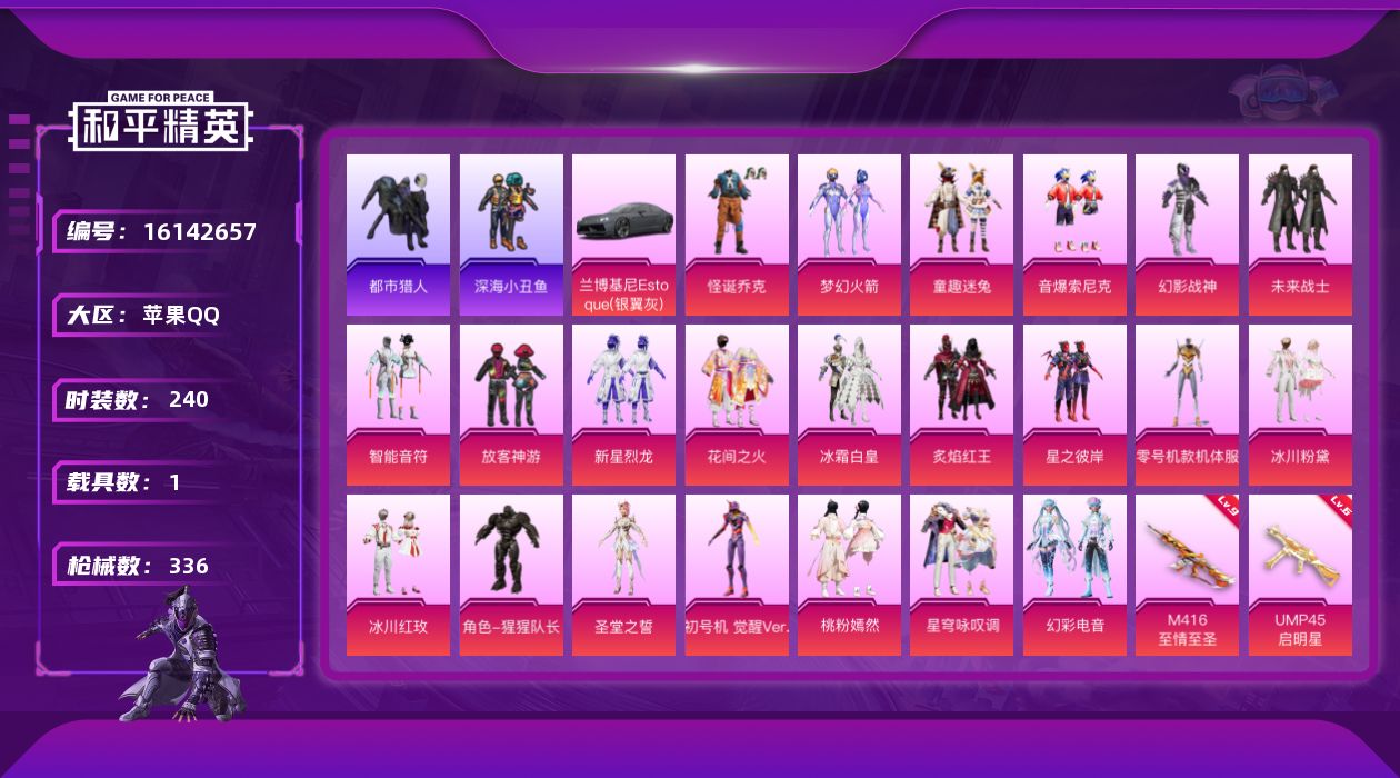 - [14538910]【1622】安卓 手Q-无敌战神框-1神装-44粉装-16特效枪-7载具-15粉色飞行器-160028热力值-17王牌印记-291套装-364枪皮 【红色载具】:路特斯EVIJA(电光紫)(六级) 【红色神装等级】:盛世惊鸿-云鸾(一级) 【红色角色神装】:盛世惊鸿-云鸾 【热门品类】:粉装-怪诞乔克,粉装-雪国幻梦,粉装-梦幻火箭,粉装-缤纷油彩,套装-浪漫天命,套装-赤蝎幽灵,套装-都市猎人,套装-冥河战士,套装-派对舞王,套装-深海小丑鱼,套装-小丑鱼,套装-奇异狩猎者,角色-军刀雅典娜,套装-胖达团团,套装-胖达圆圆,套装-天网终结者,套装-金羽特工,套装-沙漠守护者,套装-忍者信条,套装-浪客战士,角色-2B战斗服款,套装-龟仙人,套装-潮萌小黄鸭,套装-暗影哥特,M416-星际漫游 【粉色载具】:兰博基尼Estoque(炫光金),路特斯EVIJA(电光紫),路特斯EVIJA(星际黄),路特斯ELETRE(冰川蓝),焰龙咆哮,极速兔兔车,僚机-萌兔起飞,护世瑞兽 【粉色套装】:粉装-极限特训,粉装-快乐主宰,粉装-幻影战神,粉装-数码大师,粉装-怪诞乔克,粉装-甜心巧克力,粉装-宝贝奶油派,粉装-天使彩虹糖,粉装-雪国幻梦,粉装-蝶舞迷情,粉装-梦幻火箭,粉装-星之信仰,粉装-金属狂野,粉装-缤纷油彩,粉装-放客神游,粉装-新星烈龙,粉装-极致幻想,粉装-花间之火,粉装-诡面斩,粉装-绚金战神,粉装-冰霜白皇,粉装-炙焰红王,角色-初号机款机体服,粉装-海盐物语,粉装-恐龙拽拽,粉装-冷魅冰骑,粉装-赤焰黑爵,粉装-紫电风暴,粉装-炙焰牛王,粉装-妙趣可丽,粉装-闪光银龙,粉装-暖熊萌萌,粉装-灵感创作师,粉装-千面幻镜,粉装-霞光圣骑,粉装-寒光使者,粉装-雪梅暗香,角色-白勺歌姬,角色-呆萌星弥,角色-小可学妹,粉装-霓虹漫游,角色-千金淑猫,角色-智耀战神,角色-绯穹魔姬 【粉色枪皮等级】:AKM-甜心宝贝(七级),SCAR-L-梦幻火箭(七级),M416-五爪金龙(五级),M416-心之恋语(一级),M416-暖熊萌萌(一级),M416-超新星(九级),GROZA-香水柠檬(五级),AUG-妙趣可丽(六级),UMP45-雪国精灵(五级),Vector-最终圣卫者(三级),Kar98K-圣光天使(五级),Kar98K-巳巳如意(五级),M24-暗星