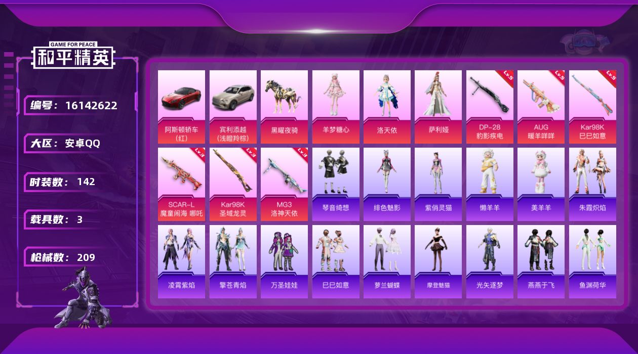 [16142622]【店主推荐捡漏号!可直接换绑】安卓 手Q-3粉装-6特效枪-3载具-6粉色飞行器-69681热力值-5王牌印记-142套装-20枪皮【粉色套装】:角色-洛天依,角色-萨利娅,角色-羊梦糖心【粉色枪皮等级】:SCAR-L-魔童闹海 哪吒(三级),AUG-暖羊咩咩(五级),Kar98K-巳巳如意(五级),Kar98K-圣域龙灵(三级),DP-28-豹影疾电(五级),MG3-洛神天依(三级)【粉色载具】:阿斯顿马丁DBS(红),宾利添越(浅瞪羚棕),黑曜夜骑【粉色枪皮】:SCAR-L-魔童闹海 哪吒,AUG-暖羊咩咩,Kar98K-巳巳如意,Kar98K-圣域龙灵,DP-28-豹影疾电,MG3-洛神天依【粉色飞行器】:四圣焕新飞行器,镜域双华-灵镜之阶,圣域金龙飞行器,飞天猪飞行器,灵珠游龙飞行器