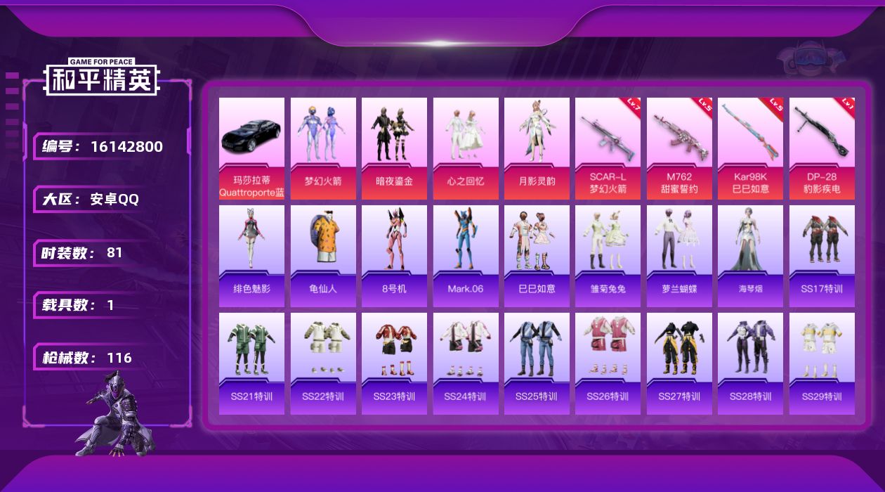 [16142800]【店主推荐捡漏号!可直接换绑】安卓 手Q-4粉装-4特效枪-1载具-1粉色飞行器-36120热力值-3王牌印记-81套装-116枪皮【热门品类】:粉装-梦幻火箭,套装-龟仙人,角色-8号机,角色-Mark.06【粉色套装】:粉装-梦幻火箭,粉装-暗夜鎏金,粉装-心之回忆,角色-月影灵韵【粉色枪皮等级】:SCAR-L-梦幻火箭(七级),M762-甜蜜誓约(五级),Kar98K-巳巳如意(五级),DP-28-豹影疾电(一级)【粉色载具】:玛莎拉蒂Quattroporte(夜幕蓝【粉色枪皮】:SCAR-L-梦幻火箭,M762-甜蜜誓约,Kar98K-巳巳如意,DP-28-豹影疾电【粉色飞行器】:梦幻火箭飞行器