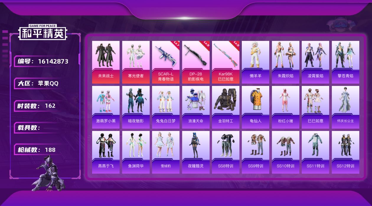 [16142873]【特价出售/店主推荐】巡查服苹果 手Q-2粉装-3特效枪-0载具-0粉色飞行器-56871热力值-13王牌印记-162套装-188枪皮